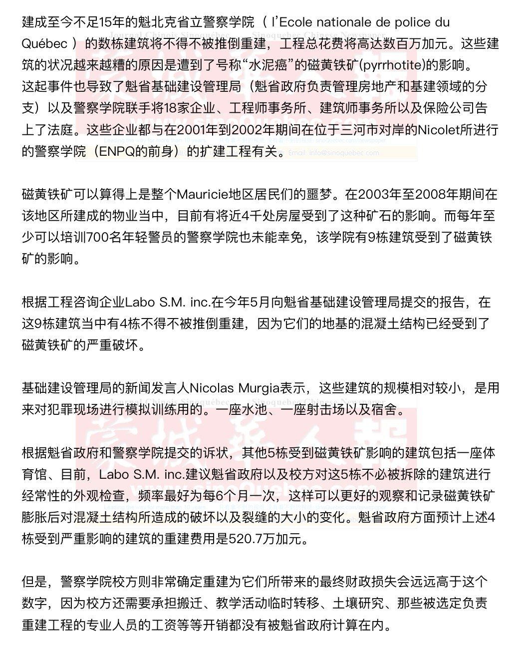 魁省基础建设管理局目前还没有决定具体何时开始重建工程。 在这起诉讼的被告席上,有水泥公司Béton Laurentide、建筑公司Construction Yvan Boisvert inc.以及采石场B & B de Trois-Rivières。其中那些带有磁黄铁矿的石材就是由后者提供的。 这已经第二次因为政府所拥有的建筑受到磁黄铁矿影响而由魁省基础建设管理局向建筑公司发起诉讼了。在第一起诉讼当中,魁省政府向那些在魁省交通厅位于三河市的Récollets大道的行政大楼建设工程中负责建设及负责提供原材料的企业索赔260万加元。 |