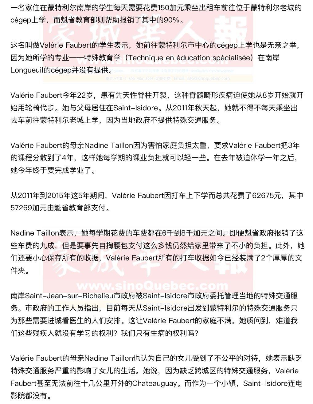 为了获得更大的行动自由,Valérie Faubert正在考取残疾人驾照。 据悉,大蒙地区的不同城区为特殊人群所提供的特殊交通服务的数量也不尽相同。一名Chateauguay的残疾人如果向乘坐特殊公交车前往蒙特利尔岛内,那么其乘车原因只能是看病,原因是缺乏资金。至于北岸的Laval市,负责该市公交系统的STL则保证,市内绝大部分地区都有上门接送的特殊交通服务,可以直通蒙特利尔,无论其乘车的原因是什么,无论其目的地在哪。 缺乏特殊交通服务的城市列表: Saint-Rémi, Sainte-Martine, Saint-Michel, Sainte-Clothilde, Saint-Patrice-de-Sherrington, Saint-Cyprien-de-Napierville, Saint-Bernard-de-Lacolle, Saint-Edouard, Hemmingford Canton, Hemmingford Village, Saint-Urbain 和Sainte-Chrysostome. 魁省教育厅的特殊需求补贴计划(PABP) - 为有特殊需求的个人提供财政援助,以帮助他们减轻由残疾对他们的学习所造成的影响 - 该计划可以报销的费用包括:专业服务、特殊交通服务以及住房补贴 - 在2014到2015年间,总共有273人从该项目中受益,政府发放的补贴总额为1461415加元 |