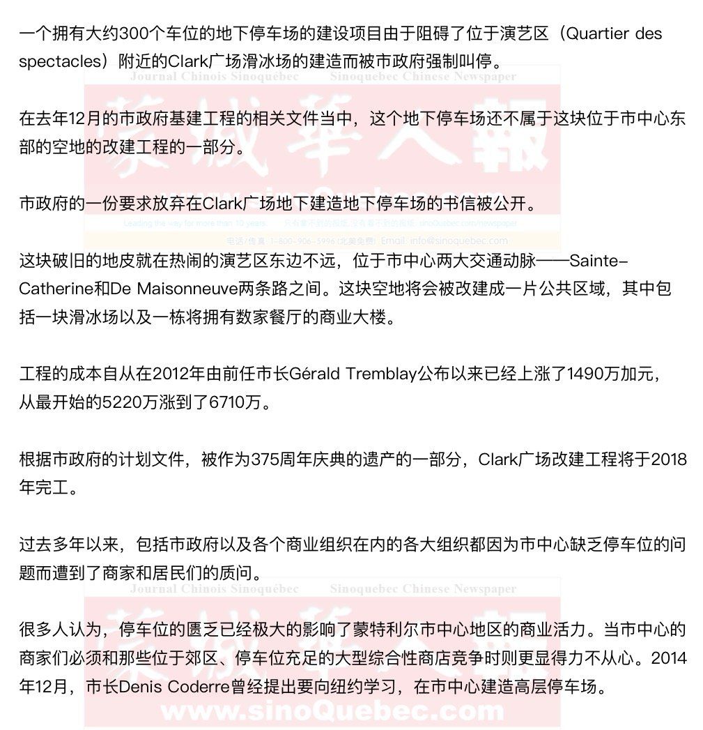 市议会的反对党认为,市政府放弃建造这座地下停车场是一个“小小的胜利”。市议会的官方反对党Projet Montréal的议员Craig Sauvé表示,建设一座停车场是对公共资金的一种浪费。他认为,如果市政府在刚刚公布了一系列关于停车场的政策后又决定保留建造这座停车场的计划,那么这将是一种出尔反尔的行为。 Craig Sauvé表示,根据市政府的最新政策,建造新的停车场并不必要。现在市政府需要做的是将现有的停车空间尽量优化。 作为演艺区的第四期工程,Clark广场的建造工程需要2年的时间,预计将于2019年完成。 位于演艺区东侧的Clark广场修建工程将于2018年开工,预计在2019年底完成。根据由市政府在一份针对工程的初步招标文件,该工程的总投资额为2800万加元。在今年6月,市政府为了该工程已经投入了350万加元。 这块位于Sainte-Catherine和De Maisonneuve两条路之间的空地在完工之后将拥有一片公共广场,一个电动制冷的滑冰场以及一个拥有餐厅、商家以及文化机构的大楼。 最初计划在2012年施工,随后被推迟到了2017年,该工程由于市政府提出的地下停车场的建设工程而被搁置。 |