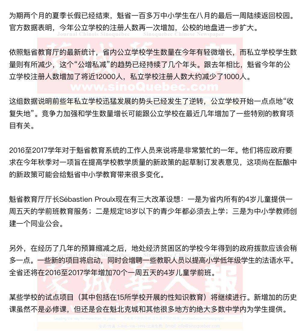 适龄儿童在魁省公立学校的入学率 2011-2012: 87,08 % 2012-2013: 87,25 % 2013-2014: 87,41 % 2014-2015: 87,61 % 2015-2016: 87,82 % 适龄儿童在魁省私立学校的入学率 2011-2012: 12,67 % 2012-2013: 12,54 % 2013-2014: 12,38 % 2014-2015: 12,18 % 2015-2016: 11,95 % 魁省公立教育系统的入学人数 Préscolaire: 102 283 Primaire: 476 825 Secondaire: 311 548 魁省私立教育系统的入学人数 Préscolaire: 5019 Primaire: 33 211 Secondaire: 83 006 Total* 1 014 168 élèves Source : 魁省教育厅 |