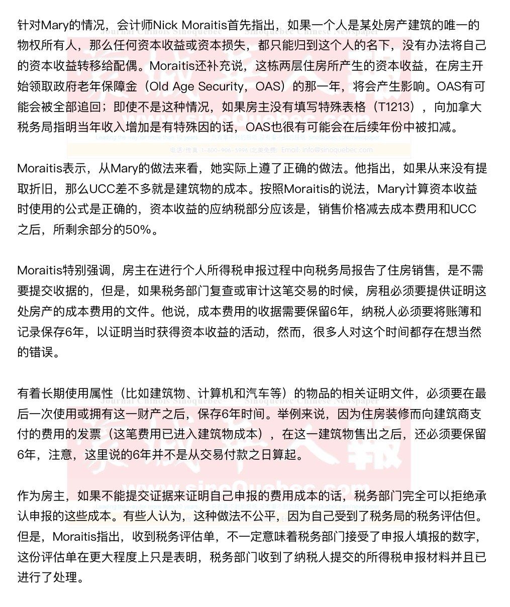 22年前,一位名叫Mary的女士在蒙特利尔Ville Saint-Laurent区买下了一栋两层套房(duplex)并将这处房产出租了出去。幸运的是,她的房客都很不错。现在,Mary快要70岁了,如果再继续打理这处房产已经有点力不从心了,因此她想要它卖掉。每一年,Mary都会非常认真地填报联邦和魁省政府要求的税务表格,而且,她从来没有申报过资本成本抵扣(capital cost allowance,CCA,以折旧摊提来抵减资产成本的方式)。不管在何时,当Mary为这处住房进行大型项目的时候,都会把费用列进“建筑物与家庭收益增加”一栏。 多年以来,她的这栋住房的未提折旧资本成本抵扣(Undepreciated capital cost,UCC)一直都在增长。换句话说,Mary在1994年购买这栋二层住房时支付的金额为120,000,现在,它的未提折旧资本成本抵扣额已经达到了135,000元。 在销售这栋房产的时候,Mary遇到了很多问题。如果她以390,000元的价格售出这套住房,那么是否能在计算资本收益(capital)的时候,从390,000元中减去多年累积的未提折旧资本成本抵扣135,000元?如果是这样,她必须要向联邦和魁省政府提供什么样的文件才能申报这笔UCC? 通常,Mary只把各种费用收据保存3年,加拿大税务局或魁北克税务局是否会要求她提供当初的一些收据?还有,这处房产仅是以Mary的名字登记的,那么有没有什么方法,能够将她的资本收益中的一部分转移给她的丈夫?因为他在公司破产的时候,结转了大约12,000元的资本损失(capital losses)。 |