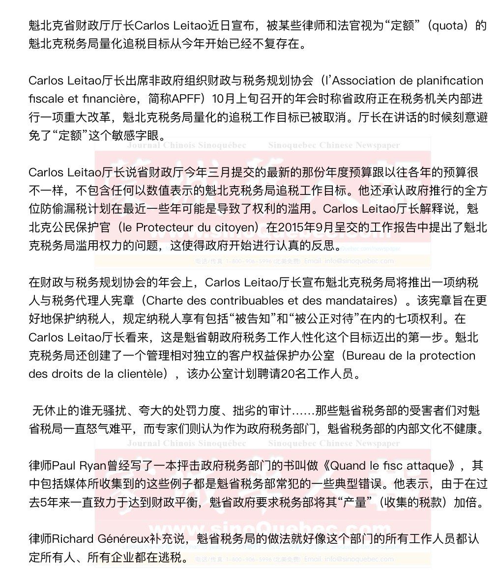 Richard Généreux还表示,给税务审计人员施加讨税配额以及提供与追讨的税款挂钩的分红这种做法更是导致了这些工作人员们严厉到疯狂的审计风格。Richard Généreux和他的Evolex已经在法庭上对魁省税务局的这种分红制度提出了控告。 为了达到目标,魁省税务局近两年开始频繁的向那些被认定逃税的个人和公司开出大额罚单,而这种手段通常只被用来处理那些情节严重的逃税者。 连锁餐厅Portovino在被魁省税务局查税之后,迅速被推到了破产的边缘。税务局认定这家公司逃税的原因是发现了后者所上报的小费只占到了全部营业额的7%而不是通常的14%,因此认为这家餐饮企业隐瞒了数千加元的收入。虽然该企业提供的充足的文件来证明自己没有任何税务犯罪行为,但是魁省税务局还是执意使用自己内部的一种独特而复杂的计算方式来审查。这种估算性的计算方式通常被用来处理那些交易数量明显不足或是大量交易用现金完成的情况。 魁省税务局使用自己内部的一种独特而复杂的计算方式来审查。这种估算性的计算方式通常被用来处理那些交易数量明显不足或是大量交易用现金完成的情况。 这种复杂的计算方式到底如何使用?律师Paul Ryan解释说,以餐厅为例,税务局经常会通过是食物的数量来计算该餐厅的营业额。他曾经在一家早餐餐厅的查账记录中发现,税务局按片来数店中的面包。 Paul Ryan认为,问题的关键所在就是税务局在使用这种计算方式时大量使用估算的方法,这就给他们留下了很大的做手脚的空间。 律师Caroline Desrosiers则认为,政府必须创建出一套完全独立的税务纠纷调解制度,这样才能保证纳税人的投诉不会石沉大海。 |