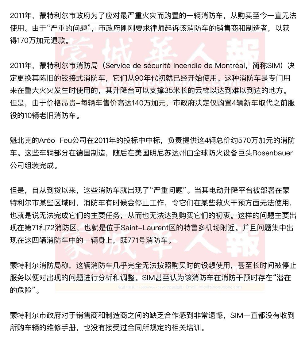 在2014年1月份,当720号消防车的一个旋转接头发生泄漏时,销售商和制造商甚至拒绝履行保修责任。 尽管收到了正式通知,销售商和制造商却并未着手赔偿市政府的损失。于是,蒙特利尔市政府决定起诉两家企业,以获得771号消防车的140万加元退款。同时,市政府还要求赔偿其从购置以来所付出的18万加元维修和检查费用。另外,针对两家企业“拙劣的服务”,市政府还要求9.6万加元以补偿市政府员工投注在消防车身上的时间。 |