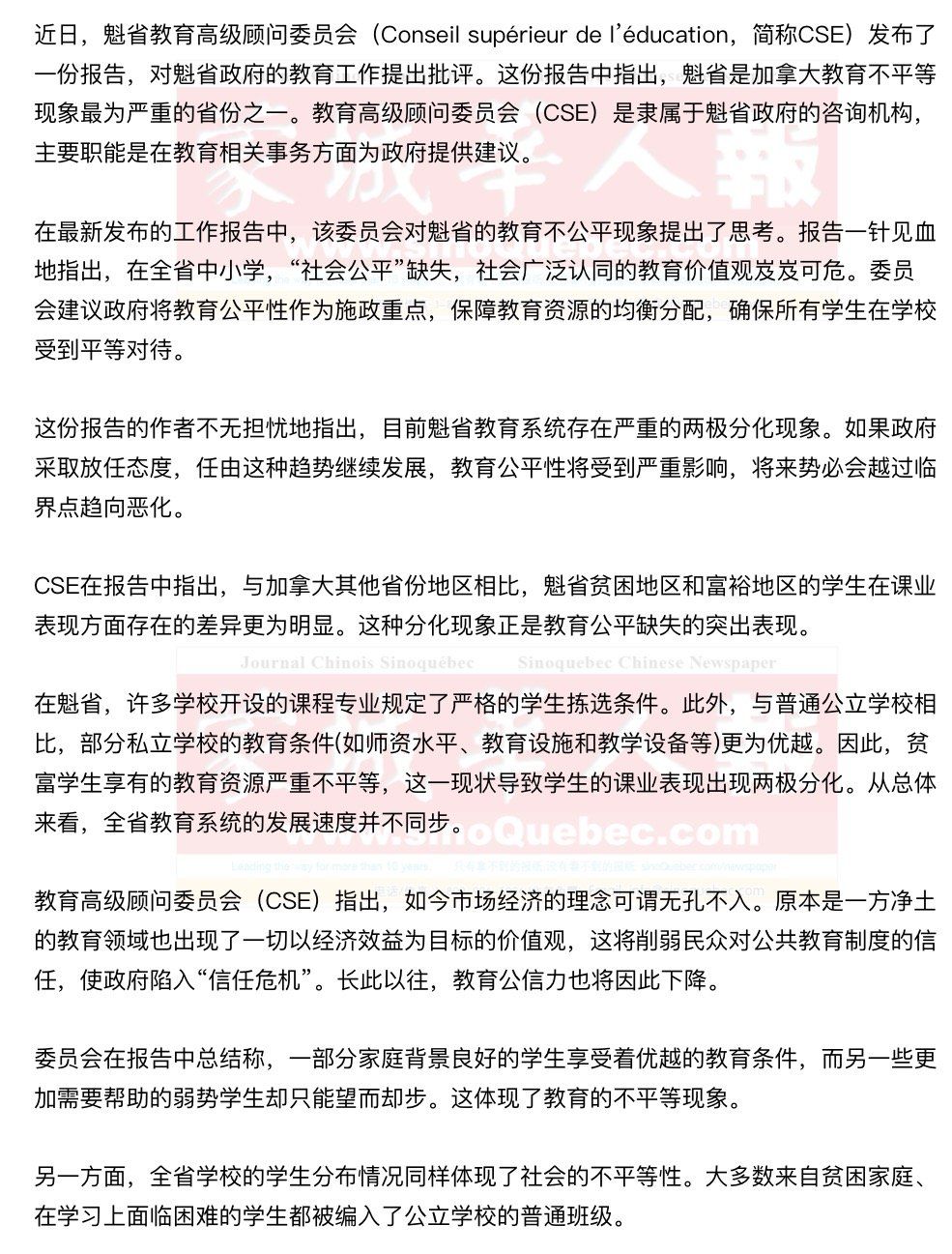 针对这一现象,教育高级顾问委员会(CSE)在报告中评论称,一大部分来自弱势背景的学生在教育系统中处于边缘地位,他们被分流到了普通班级,与其他学生相比受到区别对待。这使他们难以通过教育改变自身命运,只能陷入恶性循环。这一群体所面临的贫穷问题代代延续,而且始终难以摆脱社会的排斥。 为了解决这一问题,委员会呼吁政府促进教育机会均等,将来自不同社会阶层的学生混合编入同一所学校或班级。报告指出,多项研究已经证明,放弃班级分流制度而采用混合编班制度将会提高教学效率,而且学生成绩更为均衡,两极分化趋势将会明显减弱。 委员会还在报告中补充指出,采取班级分流制度对于学习能力较强的学生影响并不大,而对于来自弱势背景的学生则极为不利。一方面,分班制度将对教育系统的公平性构成严重威胁;另一方面,这一制度还将导致教学效率降低。 教育高级顾问委员会(CSE)倡议政府加强在教育方面的投资力度,确保全省所有学校的教学质量都达到令人满意的标准。 此外,委员会还建议政府促进教育资源的均衡分配,确保来自弱势群体的学生与其他学生享有同等的教育资源。与其致力于帮扶贫困群体,不如通过教育从根本上解决贫困。 在这份报告中,教育高级顾问委员会(CSE)对魁省自由党政府执政13年以来的教育工作进行了回顾总结。对此,魁北克未来联盟党(Coalition avenir Québec)教育事务发言人Jean-Francois Roberge直言不讳地表示,在加拿大全国范围内, 魁省的教育体系确实“最差的”。这也是自由党十多年领导的恶果。 |