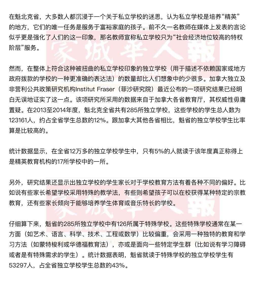 研究人员还发现,魁省有78%的独立学校部分接受政府资助。依照魁北克省教育厅提供的数据,省政府发放给独立学校的财政补贴金额如按学生人均来计算,那就大致相当于划拨给公立学校的教育经费的60%。 有些人认为省政府应该减少甚至取消对独立学校的补贴以缓解财政压力。但是从统计数据可以看出,如果没有政府的资助,很大一部分中等收入的家庭将无力承担子女入读独立学校所需要的全部费用。这样一来,很多独立学校的学生势必会转入公立学校,政府就不得不加大教育方面的支出。 魁省有八分之一的学生家长选择将子女送入独立学校并不是一个偶然的现象,这说明独立学校能够满足全省众多家庭的切实需要和各种偏好。让人们了解独立学校的优点和长项,停止传播独立学校是财富精英的特权之迷思的大好时机已来临。 |