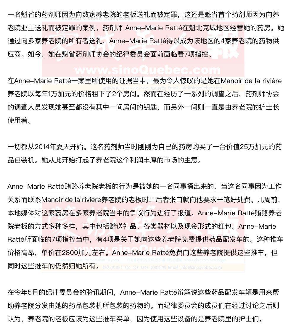 除此之外,纪律委员会还发现Anne-Marie Ratté向养老院提供大量的日用品,比如成年人用的纸尿裤,这些产品全部以成本价被卖给了养老院。除了向养老院提供这些老人们使用的产品以外,她还向Manoir de la rivière养老院的老板Yves Boutet提供大量的产品折扣。纪律委员会在判决书中写道,被告本人也承认有这样的行为。但是她认为这样的做法是完全正常的,因为养老院的老板在她的药房得到了各种折扣之后承诺帮她扩大她的客户群。 Anne-Marie Ratté向4家养老院提供的好处清单 以每年1万加元的价格在一家养老院租用2个房间,其中一个房间从来没有使用过 免费向养老院提供单价2800加元的药品配发车 以成本价向养老院提供成人纸尿裤、手套和口罩等消耗性用品 以成本价向Manoir de la rivière养老院的老板提供各种消耗性用品 |