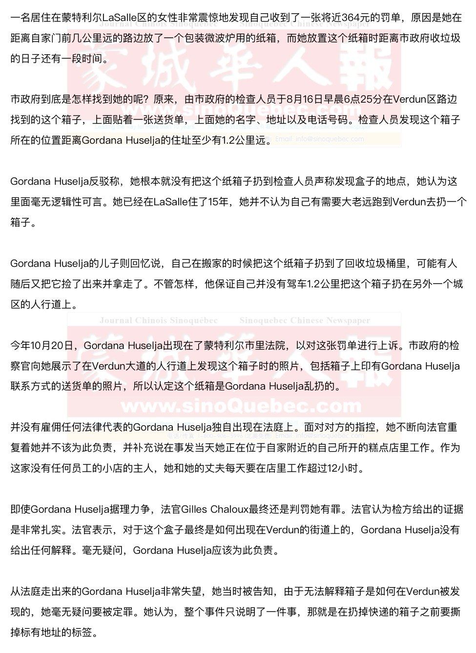 专家认为检方证据不足 不止一位法律专家认为,仅仅是因为在非垃圾回收的日期在距离包括主人家较远的地点发现了标有对方地址的包装而对对方开出罚单,市政府这样的做法缺乏有利证据。 专门帮助居民们上诉政府罚单的律师Eric Lamontagne表示,市政府不能因为在距离Gordana Huselja家几公里以外的人行道上发现了一个印有她家地址的箱子就对她进行处罚。如果这个箱子出现在她的邻居家门前,那么一切就都合理了吗? Eric Lamontagne认为,Gordana Huselja在向法官解释了她所居住的地点距离箱子被发现的地点之间有很长一段距离之后,法官应该就能够发现市政府开出的罚单所存在的不合理性。 他指出,仅仅是这一点就能引起一个普通人对市政府所给出的证据的怀疑。到底是什么人会跑到距离自己的住址数公里以外的距离把一个纸箱子扔在人行道上?如果真是这样,这个纸箱子肯定有什么不同寻常之处。 Eric Lamontagne相信,在这个案件之中,市政府的检查人员在于2015年8月在街道上发现了印有Gordana Huselja名字和地址的纸箱之后至今,根本没能拿出任何有效的证据来证明箱子是她扔在那里的。他说,所谓证据,应该展现出该违法行为确实是由Gordana Huselja犯下的。仅仅依靠一个印有她的名字和地址的纸箱来对她起诉,这种做法简直是开玩笑。 但是另外一名法律专家却表示,Gordana Huselja有责任在法庭上证明这个纸箱不再归她所有。蒙特利尔大学的市政法学教授Jean Hétu表示,法官在庭审过程中所提出的问题是合理的。在这种情况下,Gordana Huselja应该努力证明这个纸箱子不再属于她。 在法庭上,Gordana Huselja表示并不知道到底是谁把这个箱子放在了人行道上。Jean Hétu则表示,在法庭上对法官说出“我不知道”这样的话无法为自己做出任何辩护。 专门帮助市民上诉罚单的SOS Ticket公司的Alfredo Munoz则表示,Gordana Huselja试图为自己辩护失败的经历充分的证明,普通居民如果想要在这类案件中获胜,就必须要聘请专业人士来帮忙。他表示,很遗憾,公证的审判是有代价的。 |
