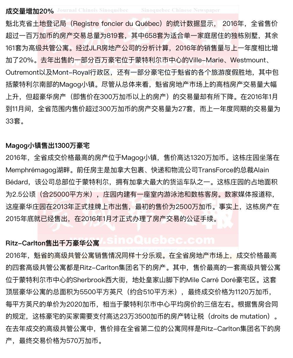在刚刚过去的一年中,魁北克省的高档住宅销售量再创新高。据统计,2016年,在魁省房地产市场上,成交价格在一百万加币以上的房产交易量超过800套 ,其中包括天后席琳迪翁在laval的豪华庄园(图)。这栋豪宅已经挂牌出售多年,但始终无人问津,去年终于被一位富商买下。本文将为您盘点2016年魁北克省的高档房产交易情况。 席琳迪翁豪宅寻得买家 2016年,歌手席琳迪翁在laval的豪华庄园终于寻得买家。这栋豪宅在四年之前就已挂牌出售,但始终无人问津,待售期间发生了一次严重的漏水事故,还经历了房价暴跌。最初将这栋豪宅挂牌出售时,席琳迪翁叫价3000万加币,而最终成交价格仅为1000万加币。这栋庄园坐落于一处面积为83万平方英尺(约合77109平方米)的私人岛屿,占地总面积为24000平方英尺(约合2229平方米)。2015年冬季,这栋豪宅由于水管爆裂而发生了一次严重的漏水事故,造成了惨重的损失,房产的维修和翻新费用高达500万加币。将这栋豪宅收入囊中的是Olymbec房地产公司的总裁Richard Stern,这家公司是魁省最大的工业房地产开发公司之一。 魁北克城及Laval房市交易概况 2016年,魁北克城总共售出了21套售价超过一百万加币的房产,其中9套为高级共管公寓,其余12套是适合单一家庭居住的独栋别墅。成交价格最高的房产是一套位于George V商业综合体(complexe George V)的豪华共管公寓,这栋大楼坐落于魁北克市中心的亚伯拉罕平原(plaines d’Abraham)对面,处于黄金地段。根据售房合同记录的信息,购房者是来自美国得克萨斯州的一户人家,最终交易价格为225万加币。去年,Laval市售价超过一百万加币的房产交易总量同样为21套,其中大部分是独栋别墅,价格最为昂贵的要数天后席琳迪翁的豪华庄园,这桩房产交易很可能拉高了laval市所有豪宅的平均交易价格。 购房者究竟何许人也 2016年,全省百万以上豪宅的交易总量比上年同期增长了20%,根据JLR房地产公司的分析,主要原因包括以下几点。首先,魁省的房价连年攀升,导致很多房产的价格突破了百万加币大观。正因如此,这些房产才进入了所谓的“百万豪宅俱乐部”。其次,2016年,加币汇率出现明显动荡,在这一趋势的影响下,众多海外购房者纷纷进入魁省房地产市场抢购百万豪宅。JLR房地产公司在分析报告中指出,在过去的一年中,加币对美元的汇率持续下跌,这一现象可能间接导致了魁省豪宅交易量的增加。 |