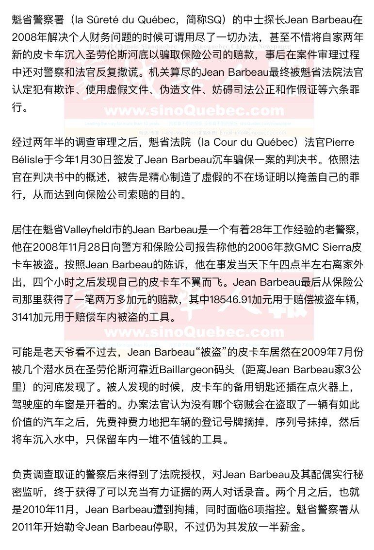虽然Jean Barbeau矢口否认自己策划了这样一起沉车骗保案,但法官Pierre Bélisle认为被告一点都不坦诚,作证时没有说实话,对重要问题的陈述多次出现前后矛盾,所以对被告的证词完全不予采信。 在Pierre Bélisle法官看来,Jean Barbeau谎报汽车被盗只可能是为了骗取钱财。事实上,Jean Barbeau报失的GMC Sierra皮卡车早已超出了汽车租用合同中规定的公里数,他需要按0.12加元/公里的收费标准为超出部分支付额外费用。法官强调说,被告声称自己从来没有过财务问题,可事实却是他很长时间以来不再有信用卡,另外还有过期未付的账单一大堆,学校税拖欠了两年都还没能交上去。 在判决书签发之后,魁省警察署发言人Daniel Thibodeau对媒体称Jean Barbeau已被停职停薪,警署还按《警察法》(la Loi sur la police)之规定启动了Jean Barbeau的革职程序。值得一提的是,从2006年因对他人施行精神骚扰而被要求停止工作到2008年沉车骗保,Jean Barbeau一直无所事事。 |