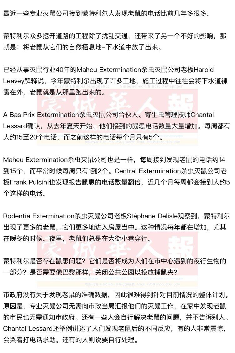 各区有统计市民拨打3-1-1报告公共场所发现老鼠或者小家鼠的电话数量。根据所记录的数据,2014年在人口密集社区发现老鼠的电话数量最多(415个)。但是这样的数据并不全面。在2015年8月以前,Mercier-Hochelaga-Maisonneuve区负责蒙特利尔老城9个区的灭鼠工作。但是,之后就是各区自己处理了。于是,电话数量的统计和灭鼠工作的方式也是各不相同,这就使的进行数据对比变得困难。 如果说在街上或者公共区域观察到很多老鼠,那么就该由公共工程的服务机构来负责灭鼠,以及修复那些令老鼠在黑暗的管道内外来回穿梭的破损的市政污水管网。 如果一名租户投诉发现老鼠而房东不采取措施,区政府可以向房东发送警告信要求其聘请灭鼠专业人士灭鼠,并且提供证明。据许多专业灭鼠公司称,一座“治理良好”的城市,每有一位居民就会有两只老鼠。照此计算,拥有大约400万人口挡的蒙特利尔市会有多少只老鼠?不过,蒙特利尔还从未做过正式的老鼠数量统计。 |