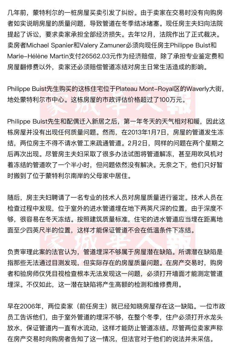 在长达27页的判决书中,负责审理此案的法官Magali Lewis写道:“在整个冬季,房屋住户必须将地下室的一个水龙头打开放水,保证水管内一直有水流动,以免管道结冰。被告(即前任房主)对此完全知情,但在房屋交易时,他们并没有向购房者如实告知这一重要情况。” 资深房地产法律专家Claude Coursol律师指出,在房产交易时,卖方必须如实详尽地说明房屋的真实情况。一旦因为卖家的疏忽而导致房屋交易后出现质量纠纷,买卖双方将不得不聘请专业的技术人员对房屋进行损失鉴定,相关费用十分昂贵。 本案的原告、现任房主Philippe Buist先生表示,他在诉讼时提出的索赔金额是最终获赔金额的两倍。尽管如此,他对于法院的裁决结果依然表示满意。通常,法官在处理房屋质量纠纷案时,会让原告和被告共同承担经济损失,即双方各自承担一半费用。 在魁省,房屋潜在缺陷引起的交易纠纷并不鲜见。每年都有数百名魁北克房主因此提起法律诉讼。在每年的前几个月,这种现象尤为突出。资深房地产法律专家Claude Coursol律师指出,很多潜在购房者选择在年初参观待售房屋。因此,在这段时间内,买卖双方更容易因为房屋潜在缺陷而引起纠纷。 房屋常见潜在缺陷一览 18 % 房屋漏水 一些房屋的墙体内部存在较多裂缝,可能导致房屋出现漏水。这些裂缝属于潜在缺陷,从外观上看并不明显,仅凭目视检查无法发现。 17 % 地基缺陷 一些房屋的地基或基土层可能出现风化或沉降。在房屋地下室完工之后,这一问题将成为潜在缺陷,从外观上无法发现。 15 % 屋顶缺陷 一些房屋的阁楼年久失修,甚至出现椽木腐朽断裂的现象,很有可能导致屋顶塌陷。如果房屋的天花板上没有可以通向阁楼的活动门板,那么这一问题将被视为房屋的潜在缺陷。 信息来源:Talbot Kingsbury律师事务所,2012年 |