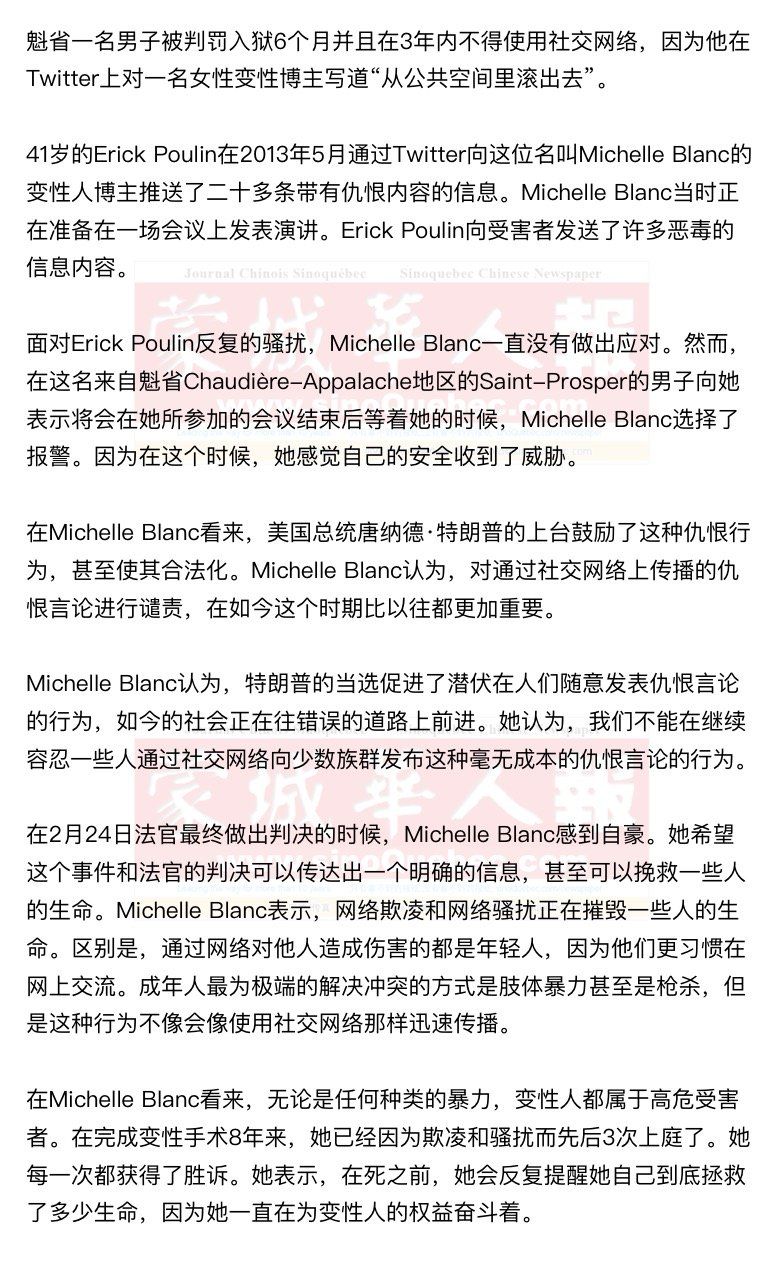 作为被告的Erick Poulin则有多条犯罪记录,包括违反保释条例。此次,他将入狱6个月,而且在3年内不得使用社交网络。 过去在网络上被人攻击,若没有即时撷取画面,常常苦无证据提告,以致于无法维护自身权益,有鉴于此,Twitter 最近将推出一个新工具,让用户能够获取证据进而报警。使用方式也十分简单,当你在网路上人身受到攻击或威胁时,只要向 Twitter 检举,之后检举人将会收到 Twitter 寄送电子信件,信件内容包含检举内容以及报案程序。 |