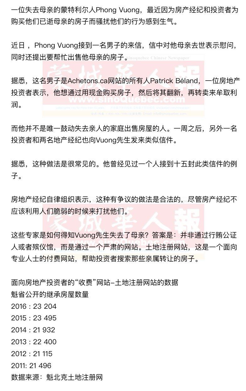 现金支付房屋市场 只要浏览网页就能够看到,十多家魁北克房地产企业都提到可以使用现金购买房屋,就像两名投资者建议Vuong先生的那样。 Ghislain Larochelle概括地说,这里所说的是一些投资者,他们的首要目的是以低廉的价格购买那些难以出手的房子,比如说需要翻修的房子。 其实Béland先生无需在他的广告里写上“我们给你最优惠的价格”,因为想要快速出售房子总是需要付出一定代价的,那些家庭急于出售已故父母的房子来兑现。 Patrick Béland承认,那些不急于卖房子的家庭不会有兴趣同他做交易。他说自己2016年在蒙特利尔地区已经收购和出售了二十几套这样的住宅。 卖方需要便宜多少来换取快速交易?Béland先生回答,每套房子的情况各不相同。 这位经纪人在6年前曾经对一些投资者进行试探,他们会出价25万元来购买据专业人士评估价值在超过43万加元和50万加元的蒙特利尔住宅。 Ghislain Larochelle建议,客户最好花费500加元聘请注册评估师来给出自己房屋的真正价值。 在某些情况下,房地产投资者会找出房子的诸多问题,来声称房子仅值30加万元,而卖家如果通过常规渠道出售的话,很可能将收获45万加元。 |