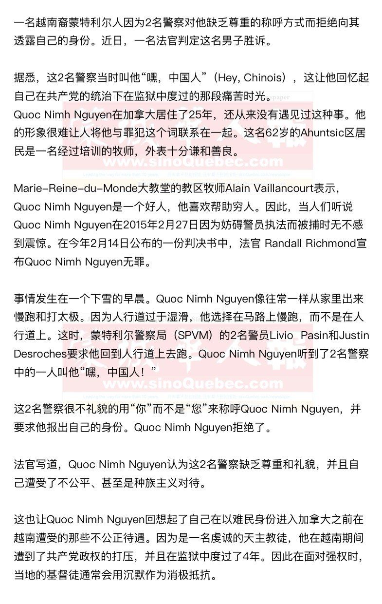 由于拒绝报上自己的身份,2名警察把Quoc Nimh Nguyen铐起来并带到了警察局,而他们在警察局也无法确定他的身份。因为身穿慢跑服,Quoc Nimh Nguyen当时没有携带任何证件。 警方建议他在电话上与一名律师通话。Quoc Nimh Nguyen拒绝了,因为他不相信电话另一头的是一名真正的律师。在整个过程中,Quoc Nimh Nguyen一直拒绝透露自己的姓名。 Quoc Nimh Nguyen因此在监狱里度过了一个周末,原因仅仅是2名警察想因为在马路上行走而对他开出15加元的罚单,却无法得到他的姓名。 在查询了魁省道路安全法规之后,法官发现相关规定指出,当人行道不够安全时,行人可以在马路上行走,而这正是事发当天Quoc Nimh Nguyen所遭遇的情况。 Randall Richmond法官指出,Quoc Nimh Nguyen拒绝透露自己的姓名是因为他的权利遭到了侵害。他的目的并不是给警方的工作增添困难。Randall Richmond法官随后宣布Quoc Nimh Nguyen无罪。 对于2名警察所使用的“嘿,中国人”的称呼,法官给予了指责。他表示,这2名警察在没有任何理由的前提下就使用了这种种族标签或是国籍标签。 Quoc Nimh Nguyen此前一直在等待法官的判决以提交一份针对警方的道德申诉。如今判决已出,他将很快采取行动。警察局方面则拒绝对这个案件做出评论。 |