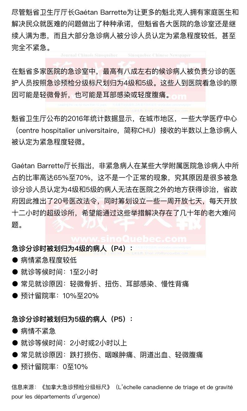 在魁北克市的Hotel-Dieu医院,将近70%的急诊病人是病情紧急程度和优先级别很低的4、5级病人。在蒙特利尔市的蒙特利尔大学附属Sainte-Justine儿童医院的急诊室中,4、5级病人所占比率大约为56%。这一比率在蒙特利尔心脏病研究院(Institut universitaire de cardiologie de Montréal)更是超过了64%。 魁北克急诊医生协会(Association des médecins d’urgence du Québec)主席Bernard Mathieu博士认为Gaétan Barrette厅长在错误地使用急诊预检分级标尺引导病人。按照Bernard Mathieu主席的观点,厅长先生关于4、5级病人不必看急诊的说法是完全站不住脚的,因为有将近10%的4级病人最后需要住院治疗。 魁北克病患保护理事会(le Conseil de la protection des malades)主席Paul Brunet对魁省卫生厅提出的数字化目标有所质疑。他说按照省卫生厅让80%的魁北克人拥有家庭医生和能够在48小时内得到家庭医生诊治的设想,医院急诊室的4、5级病人应该明显减少才对,但实际情况却不是这样。另外,得到民众支持的超级诊所计划到目前为止也未见得有效。 2016年蒙特利尔地区4、5级病人在医院急诊病人中所占比率 ◆ 皇家维多利亚医院:43.1% ◆ 犹太总医院:38% ◆ 蒙特利尔儿童医院:65.7% ◆ 蒙特利尔大学附属Sainte-Justine儿童医院:55.9% ◆ Maisonneuve-Rosemont医院:43.6% ◆ 蒙特利尔大学附属Notre-Dame医院:28.7% ◆ Sacré-Cœur医院:37.3% ◆ 拉瓦尔市Cité de la Santé医院:41.4% |