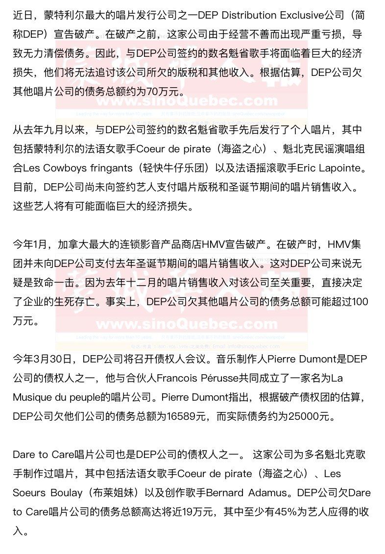 在所有向DEP公司追讨债务的签约歌手中,民谣乐队Avec pas d’casque是损失最为惨重的艺人之一。这个乐队来自蒙特利尔本地,去年九月刚刚发行了一张新唱片。 Spectra Musique唱片公司的经理Francois Bissoondoyal强调指出,DEP公司的破产事件令众多唱片公司蒙受了巨大的经济损失,除此之外,这次事件应该为整个唱片行业敲响警钟。整个行业应该群策群力,思考今后如何应对此类突发事件,避免业内机构和艺人再次因此蒙受损失,特别是即将发行唱片的公司和个人。Francois Bissoondoyal指出,DEP公司是魁北克最大的唱片发行公司之一,在全省唱片业占有举足轻重的地位。这家公司的破产对整个行业造成了重大影响。他认为,目前,唱片行业的首要任务是积极采取措施重建行业秩序。 |