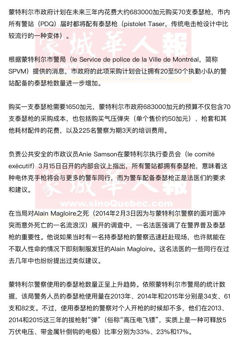 蒙特利尔市警局负责电击枪项目的Marc-André Dorion警官解释说,泰瑟枪的威慑力量很大,持枪警察即便是只使用演示模式(不触动电极),与之对阵的那个人通常都会转变态度,听从警察指令。 2010年,蒙特利尔市政府曾为这种有争议性的武器举行过一场公共听证会。有相关人员提出,不应该完全用泰瑟枪替代警察培训,因为在面对酗酒、吸毒或精神失常人员(在遭泰瑟枪电击的人中,此类人员比率高达78%)的时候,警务人员的专业素质比泰瑟枪更为重要。 蒙特利尔公共安全委员会也提到了两例市民遭5万伏电流电击(一人遭电击5次,时长总计30秒;另一人遭电击6次,时长总计43秒)死亡的个案。调查显示,不幸丧命的那两个人对公共安全并不构成任何危险。 蒙特利尔大学(Université de Montréal)的犯罪学教授Rémi Boivin指出,这类案件凸显了泰瑟枪应用方面的缺陷,其生产者直到最近才做出特别说明,称泰瑟枪对同一人的电击次数不应超过3次,每次电击时间不应超过5秒。 Rémi Boivin教授还补充说,由于人们认识到泰瑟枪能够有效代替警察配备的致命性武器,社会各界对泰瑟枪的争议已经有所减少,但某些团体对电击武器的反对却也不无道理,因为泰瑟枪不是万能的,不能用它来替代其他的一些手段和方法,比如说沟通和轻度身体控制。 |