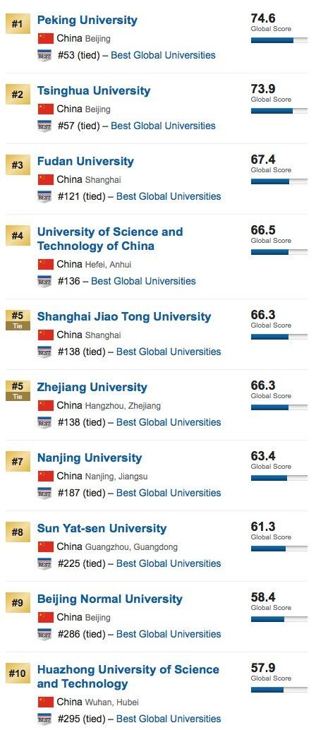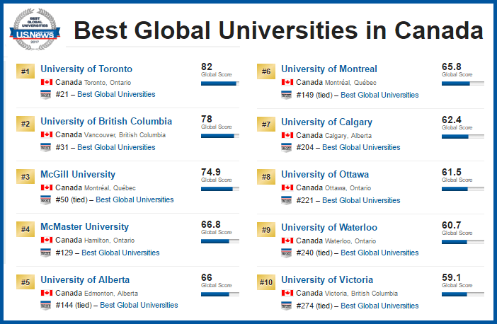 在U.S. News最新发布的全球最佳大学年度排名中,蒙特利尔的McGil大学列加拿大最佳大学第三位,排在第一位的是多伦多大学,第二位是温哥华的UBC,蒙特利尔大学列第六位。( 点击这里看更多 ) 这是U.S. News第三届全球最佳大学年度排名,排名根据学校声誉、学术研究表现、发表论文的数量和质量、论文被引用的次数、国际和北美学术机构成员的评分等。 在这个排名中,中国的北京大学列中国最佳大学第一,清华大学列第二,复旦大学列第三。以下是中国最佳大学前10名。 |