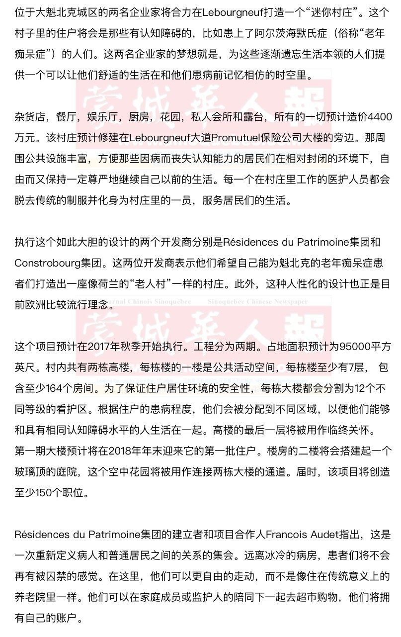 Résidences du Patrimoine集团在魁省目前拥有6家养老院,提供大约700个席位。 自2010年以来,不少养老院都专门开辟出给患有老年痴呆症的患者居住的区域。事实证明这种专门针对老年痴呆症患者的护理需求正在迅速增长。 Audet先生指出,他和他的生意伙伴会完全承担这个工程所带来的经济风险。他们没有与政府签订任何协议,包括任何加入公立资源网络的协议。这2名企业家还希望在新的养老院里使用加入更多的高科技元素。比如说,他们正在计划给养老院的住户们配备平板电脑,以帮助他们给自己制作个人日程表。 Constrobourg集团总裁Réal Bourdeau指出,他们希望可以给住在养老院里的老人们提供最佳的生活质量、帮助他们维持一定的生活自主性,并减少他们的压力。Réal Bourdeau还丝毫不隐瞒自己在魁省其他地区开展类似计划的想法。 养老院所拥有的各种设施将仅供住户和他们的家属使用。每个房间每月的价格从4200加元到5800加元不等,价格根据住户的需求有所不同。在该工程中承担建筑设计工作的是Coarchitecture Normand Hudon建筑师事务所。 在该地区,另外一家叫做Maison Echo du Coeur的养老院提供相似的服务,但是规模相对要小得多。成立于2009年的这家养老院可以接纳9名轻度到中度老年痴呆症的患者。 据悉,魁省全省范围内目前有超过12.5万人患有老年痴呆症或是相关疾病,其中有1.5万人在魁北克城及其周边地区。在全国范围内,有74.7万人患有认知性疾病。根据魁省老年痴呆症协会预测,在15年内,加拿大将会有140万名认知性疾病患者。 据悉,Résidences du Patrimoine集团与Constrobourg集团还将会联手打造一家专门接纳老年人的住宅项目的消息。该房地产项目坐落在L’Ancienne-Lorette,将拥有大约570套住房。第一期工程预计在今年5月开工。 |