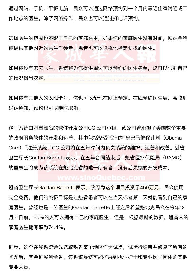 在花费了一年时间为魁省家庭医生建立了注册系统后,魁省卫生厅网上在线预约医生的集中门户网站已初具成形,从而缓解家庭医生预约的困难,使没有家庭医生的病人也能得到及时的医疗服务。这个网站还在建设中,不过民众已可以在线浏览一些信息,网址是:https://www.rvsq.gouv.qc.ca/home.html , 手机app应用的名称为“Rendez-Vous sante Quebec” |