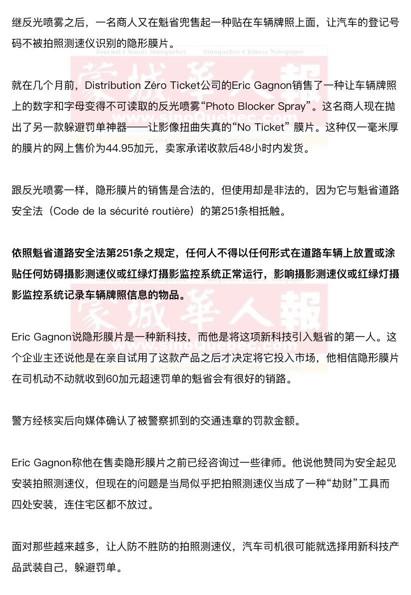 Eric Gagnon表示,他为人们提供的是一种免受罚单伤害的保护产品,而且买卖是自由的,人们知道使用这种产品的后果。这名商人还说去年秋季他在自己的私人住宅接待了两名来访的调查人员,然后收到了一份魁省警署(Sureté du Québec)发出的警告函(mise en garde),所以他现在只是做网上销售,而且所有与政府和警方相关的事情都交给了律师处理。 Québec-Ticket交通告票服务公司的主席兼创始人Karl Hamel希望大家不要以身试法。他说Québec-Ticket公司聘请的律师都强调车辆牌照在任何时候均应保持清晰可见,如果使用隐形膜片的罚款金额比超速罚单低,一些人在比较之后决定给自己的车牌贴上这种膜片,那么政府最终也可能调整政策,提高违规使用隐形膜片的罚金。 前警员Alain Gelly认为应该辩证地看待拍照测速仪的作用和影响,因为毕竟有很多人对这种“束缚自由”的仪器持支持态度。 |