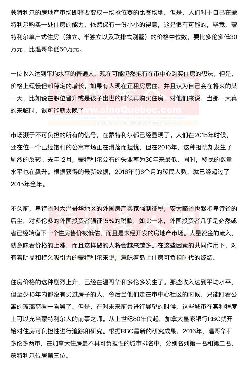 在这3座城市中,尽管收入中位数相差不大,但是,住房价格指数(一部分房地产委员会经过计算用于代表接近房产价格真实水平的一个数字)足以将人们从自鸣得意中警醒。在多伦多,住房价格指数是727,300元,在温哥华,这个数字是906,700元,数字中已经将公寓包括在内,温哥华单户式住房的基准价格,超过了120万元。 不过,目前的情形即便看起来越来越像是暴风雨前的平静,但应当说还算不错。根据蒙特利尔房地产市场分析公司JLR的说法,今年蒙特利尔的住房价格中位数为410,000元,比2015年上涨了4%;收入中位数(收入数字的中间值,平均数容易随两端的极大值和极小值波动),在2014年为75,010元。这些都是能够获得的最新年份的数值。蒙特利尔人的这个收入,决定了他们的债务状况,可以让人们获得价格在35万元左右的住房的抵押贷款。这与中间值非常接近,意味着对于普通人来说,仍然有大量的住房是负担得起的。蒙特利尔的收入中间值和其他地方相差不大,与多伦多和温哥华的差距也只是在1,000元之内,但是住房价格却是另外一种情形了。RBC的住房可负担指数,已经将情况清楚地表明了。 RBC计算了房主的全部成本,抵押贷款利率、欢迎税以及其他种种,然后再将这个成本与家庭收入中间值进行对比,并以百分比表示出来。RBC资深经济学家Robert Hugue表示,这里面有一个首要的原则是,费用与收入中间数的比值为32%的时候,住房是可负担的。 蒙特利尔在2003年的时候就越过了这个点,但是现在,所有房型的费用与价格中位数的比值为40%,意味着总收入中的40%必须要用于自己的住房。在多伦多这一比值是64%,温哥华为92%。不过,这其中有两个重要点需要指出。 第一,单纯对单户式住房进行观察,多伦多的这一比值上升到了了76%,温哥华涨更为荒唐,达到了130%,但是蒙特利尔仅上涨了一个百分点,只有41%。这表明,在公寓和单户式住房的费用支出上,三座城市没有什么不同,也意味着购买住房是更有意义的;第二,蒙特利尔现在是否还在这个40%标线上?这就跟15年前的多伦多一样。没有人认为蒙特利尔的市场将会重现那种急剧的攀升,但是可负担能力,在岛上的住房永远脱离普通人的把握之前,上升的并不高。 也许,有人会满怀期望,魁北克省政府将会进行政策调控,通过不时对住房价格进行打压来伸出援手,给予自己第二次机会。但是,不会有这种情况的。魁北克房地产委员会协会市场分析师Paul Cardinal表示,自从上世纪90年代以来,还没有发生过任何的价格回落。 JLR的分析师Joanie Fontaine指出,公寓又是另外一回事了。在市场的最低端,总是能够找到一些面积较小的房产的。但是,如果想要买的是单户式住宅,现在可能就应该出手了。她说,随着人口的增长,单户式住房将会越来越少,而且,这种类型住房的价格增长将会更快速,想买这样的住房,人们可能必须要远离市中心,必须要离开蒙特利尔岛。所以,如果想要拥有一处住房,最好现在就要着手了,而且还要迅速。 |