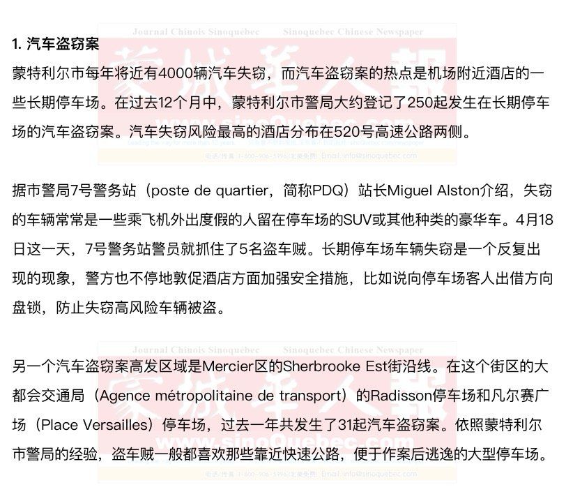蒙特利尔市警局(le Service de police de la Ville de Montréal)最近在蒙特利尔市政府的门户网站上贴出了一张该市的犯罪地图,民众从此可以通过这张电子地图得到与城市治安相关的一些信息。 按照犯罪地图显示的内容,蒙特利尔机场附近的酒店是汽车失窃最严重的地方,蒙特利尔大学(Universités de Montréal)和麦吉尔大学(Universités de McGill)旁边是入室盗窃案最高发区域,Emilie-Gamelin公园和Cabot广场四周则是小偷和抢劫犯的集中地。三类多发罪案特点如下: |