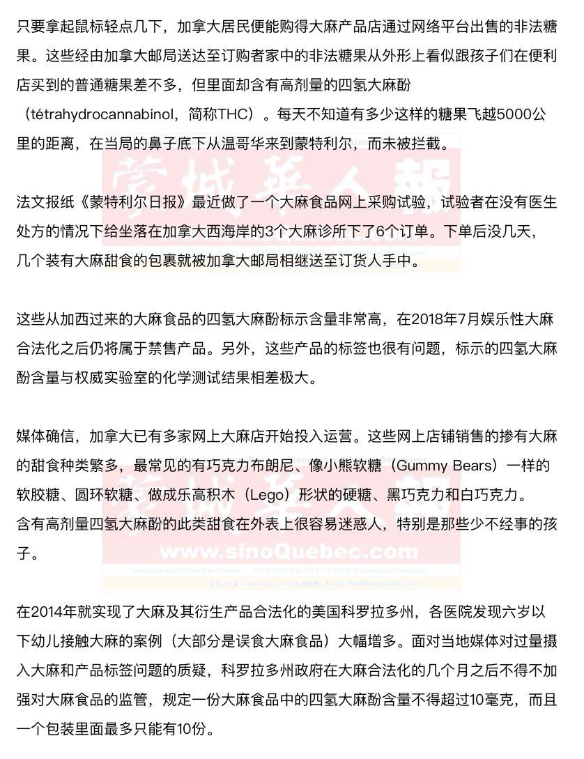 一个经加拿大卫生部(Santé Canada)核准的实验室对7份通过网购获得的糖果和糕点进行了鉴定分析。化学实验员们将产品制造商标示在商品标签上的四氢大麻酚含量与检测结果进行了对比,发现两者之间存在着巨大差异: ● 在一种做成乐高积木形状的硬糖中,四氢大麻酚的实际含量为29毫克,但其标示含量却为120毫克。 ● 四氢大麻酚标示含量为300毫克的一板巧克力所含的这种精神活性物质实际上只有130毫克。 什么是四氢大麻酚? 四氢大麻酚的英、法文简称均为THC,是大麻中的主要精神活性物质。 现行法规禁止大麻食品的销售与制造 就目前而言,即便是得到加拿大卫生部授权的大麻生产商也无权生产或销售由大麻制成的可食用产品。 有医生处方的人可以购买干大麻或大麻油,自行加工后供个人使用。 |