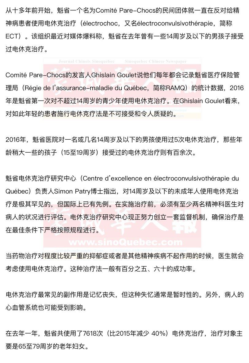 反对人士Ghislain Goulet提出,治疗精神疾病有很多种方法,并不是一定要用这种让大脑产生痉挛,不良反应大约持续4星期的电休克治疗。 Simon Patry博士强调,现如今的电休克治疗技术要比上世纪70年代先进很多。长时间以来,人们都把电休克治疗跟“酷刑”联系在一起,却忘了它是一种可以拯救生命的安全的治疗方法。 Ghislain Goulet指出,电休克治疗在魁省的使用往往取决于临床医生的个人偏好,具有很大的地区差异性,使用这种疗法最多的是中部地区的Drummondville市。 |