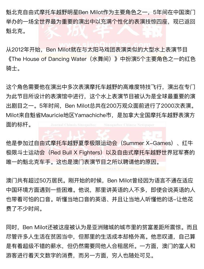 经过了几年参加摩托车越野赛的车手生涯之后,Ben Milot在2000年代初选择了自由式摩托车越野表演的道路。 现年34岁的摩托车越野运动员在他的职业生涯中共遭受了20多次骨折、脑震荡和韧带撕裂等伤痛。但这些伤痛从未能阻挡他再次跨上自己喜爱的坐骑。 他笑着回忆说,记得在1992年,他第一次参加比赛的时候,摔断了一条腿。护士曾以讽刺的口吻对他说,她认为他的摩托生涯将到此结束。今天他希望能够再次见到这位护士。 因为已经“吃腻了米饭”,特别是他还想要尝试新的挑战,想要看到家人,所以Ben Milot结束了同中国的合同。 如今,他将致力于自己离开之前于2010年创立并且多年只能远程管理的Milot Land Tour摩托车越野之旅。 |