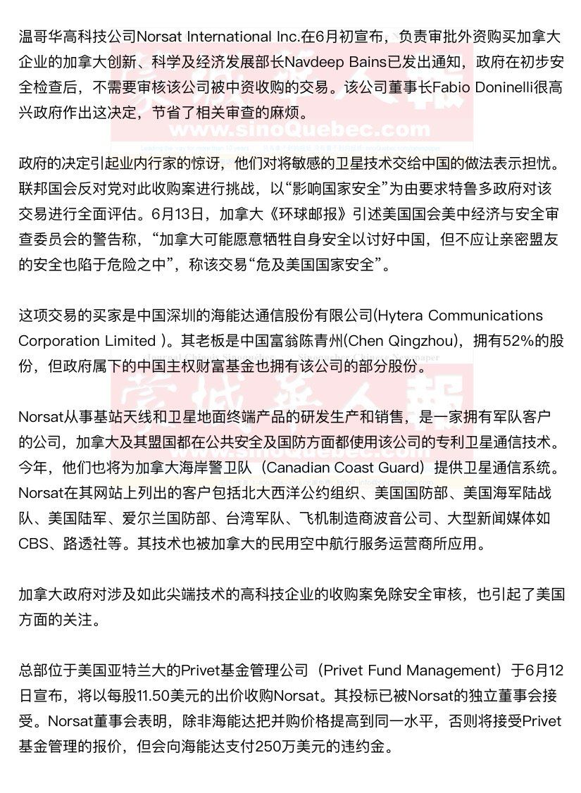 近日,深圳海能达(Hytera Communications)宣布退出收购。 加拿大反对党怀疑,自由党政府迅速批准中国企业的收购案,意在讨好中国,以便与加拿大拟缔结自由贸易协定。特鲁多政府上台后已经有几次对中资收购加拿大企业的风险表现出不够关心,比如2月份批准中国安邦保险集团收购卑诗省最大的安老院连锁店Retirement Concepts,使中资公司得以进入加拿大的健保系统,而安邦集团的所有权结构至今没法说清,集团董事长及一些董事是中共元老的亲属,安邦董事长吴小晖近期频频传出被中国证监部门调查的消息;3月份,政府批准中资公司O-Net收购蒙特利尔的光纤技术领先公司ITF Technologies,这项收购之前已被保守党政府拒绝,理由是“会损害西方军队对中方的技术优势”。 而海能达早就是欧美政府关注的企业,今年3月,美国电信设备巨头摩托罗拉将海能达告上法庭。海能达曾是摩托罗拉在中国的产品经销商,被告大规模盗窃摩托罗拉的专有技术。摩托罗拉的发言人指出,海能达通过窃取摩托罗拉开发的技术和知识产权,找捷径进入竞争激烈的数字无线电产品市场。不过,海能达不承认摩托罗拉的这些指控。 加拿大总理特鲁多6月13日在加拿大国会说,在批准中国海能达公司收购加拿大Norsat卫星通讯公司之前,已经同盟国进行了磋商,直接征求了美国的意见。他并指出,这桩收购属于加拿大投资法(Investment Canada Act)的监管范围,“已经经过所有国家安全机构的仔细评估”。 |