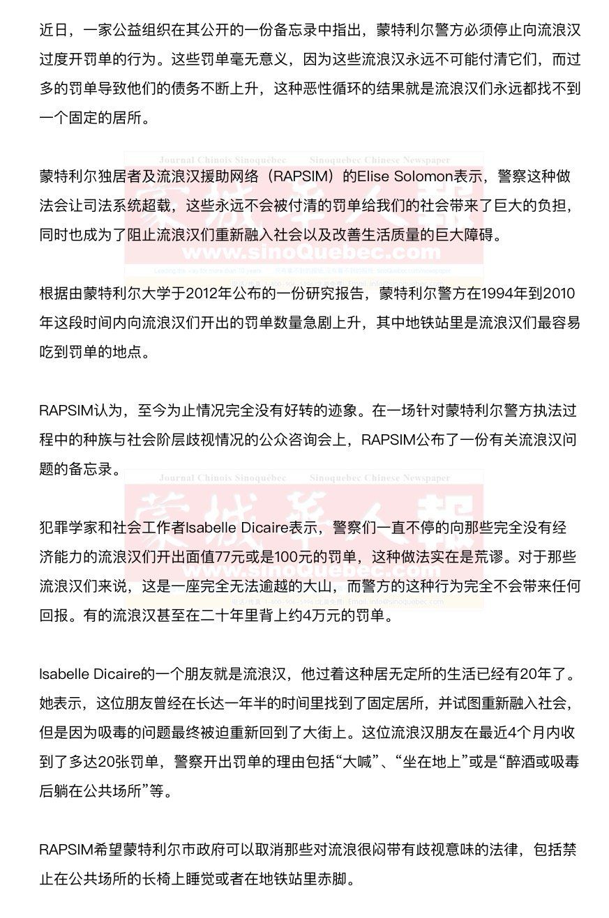 RAPSIM的社区组织者Elise Solomon批评道,市政府似乎非常热衷于处罚那些并不构成刑事犯罪但是却打扰了公共期间内的其他人的行为。这些行为大多与那些除了马路以外别无其他去处的流浪汉们有关。 RAPSIM还向蒙特利尔警察局(SPVM)要求引入一项全新的计划来遏制警方内部一直存在的种族和社会阶层歧视问题,包括引入一套旨在减少针对流浪汉的罚单数量的全新策略。 SPVM创建的机动介入小队(Equipe d’intervention mobile)以及蒙特利尔市政府从2014年至2017年一直在执行的针对流浪汉的行动计划都得到RAPSIM的表扬。 蒙特利尔公交管理局则表示,其执法人员表示,对待所有人都一视同仁,不会根据社会阶层而采取不同的行动。而公交局则表示,他们关注的首要问题是乘客们的安全。只要遵守相关规定,公交局对地铁站里的流浪汉会给予最大程度的容忍。 |