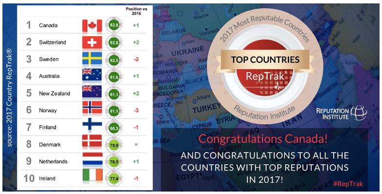 近日声誉研究机构The Reputation Institue公布了全球声誉排行榜,加拿大位居榜首,成为世界上最佳声誉国家。 此次排名以17个不同的指标对世界上国内生产总值最高的55个国家进行评分。 排名受三个大方面影响:国民生活质量,政府的有效决策,经济发展。 调查发现几个与良好的信誉相关的关键指标。在“世界幸福报告(World Happiness Report)”排名高的国家,以及在“全球和平指数(Global Peace Index)”排名高的国家,都会被认为是信誉度高。减少腐败也更可能让一个国家拥有良好的口碑。 全球声誉最佳国家排行榜从2011年开始举行,在7年的评比中,2011年、2012年、2013年、2015年和今年2017年,加拿大五次都是排名第一,2014年和2016年排名第二,无愧于全球最佳声誉国家的称号。 中国在55个国家排名中位列第47位。 全部排名: |