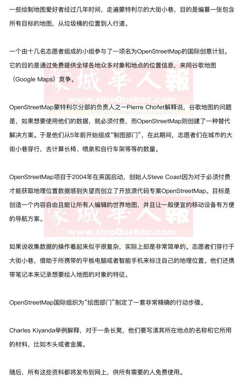 此活动的参与者之一Christophe Lefrancois开玩笑说,有时候,商人们看到他们正拿着笔记本记录,以为他们是市政府的监察员,而从商店里走出来。 Charles Kiyanda还说,如果有人愿意,可以参与测量城市里所有的人行道来为行动不便的人制作一张地图。 他们甚至走在谷歌地图之前,第一个为自行车路线而不仅仅是汽车路线创建应用程序。 参与此项目的人也可以在自己的业余时间来做这项工作,但是许多人更愿意利用参加“制图部门”的机会来认识其他制图爱好者。 Stéphanie Coté说,是她的一位同事同她谈起这个项目,所以她加入到项目中来并且真心喜爱这项活动。 |