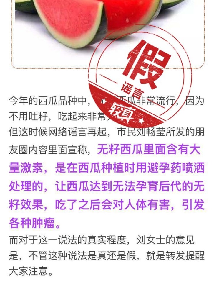 较真鉴定: 1、传了多年的“西瓜又红又甜靠打针”,其实并不靠谱,在现实中“打针”操作性差,而且还会加速西瓜腐烂,得不偿失。 2、西瓜和桃子一起吃并不会中毒,夏天吃西瓜和桃子注意防止腐败变质才是关键。 3、不必谈“膨大剂”色变,它是合法可用的植物生长调节剂,而且由于用多了反而会适得其反的特点,所以一般在西瓜上的使用量很低,出售时残留量也低于安全标准。 4、糖尿病人并不是绝对不能吃西瓜,注意控制少吃一点是可以的。 5、无籽西瓜的培育和谣传的“避孕药”没有任何关系。 6、西瓜确实热量高,如果想控制体重的话,三餐之外应该注意不要一不小心吃很多西瓜。 查证者:阮光锋,食品与营养信息交流中心科学技术部主任,微信公号ruanguangfeng。 西瓜是夏季水果明星。可是,关于西瓜却有非常多的流言,比如“西瓜打针注射增甜剂”、“西瓜使用膨大剂”、“糖尿病人不能吃西瓜”、“无籽西瓜都打了避孕药”等等,这些说法让人们忧心忡忡。还能愉快地吃西瓜吗? 西瓜又红又甜靠打针?不靠谱,这是一个传了多年的谣言 每到夏天,“打针西瓜”的流言就会被人们翻出来,网上说得也是头头是道:有些瓜农为了销量,会对西瓜进行增甜处理,并且为了卖相,注入红色素(胭脂红等)和甜味剂(甜蜜素、糖精等),使西瓜更红更甜。 其实,这个打针西瓜的流言我也做过实验澄清。西瓜打针并不是事实,只是臆想。 西瓜本来就是一种自然熟的水果,而且比较容易保持。在实际种植收获过程中,也没有瓜农会闲得无聊去给每个西瓜打针,无论是往西瓜里面打激素、糖水还是色素,都不会促使西瓜变红变甜。相反的,打针还会使针眼附近的瓜肉腐烂变质,大大缩短西瓜储藏时间,这样对瓜农来说太得不偿失。 ![]() 西瓜和桃子不能一起吃?放心吃,“食物相克”不科学 最近几年,一则“西瓜和桃子同吃会使人中毒身亡”的流言总是被人们转发,说法称,桃子不能与西瓜一起会产生剧毒,甚至使人死亡。西瓜和桃子一起吃真的会中毒吗? 其实,作为水果,西瓜和桃子中最大的成分是水分和糖,它们都没有什么毒性成分,它们一起吃也不会发生什么特殊的化学反应,或者产生什么奇怪的毒性物质。而且,营养学中并不存在食物相克的说法,科学家对食物相克的组合也进行过验证,结果发现都是不靠谱的,西瓜和桃子并不会相克。不过夏季气温高,西瓜和桃子在储存过程中的确更容易被细菌污染,导致腐败变质,如果食用倒是可能使人产生腹泻等问题,也不至于中毒死亡。夏天吃西瓜和桃子注意防止腐败变质才是关键。 ![]() 使用了“膨大剂”的西瓜吃了有毒?不必担心 以前买西瓜,我们都喜欢挑个头大的。但是,现在西瓜个头大,人们就会说是因为用了“膨大剂”,以至于现在很多人在买西瓜时也尽量挑小的买,生怕买到使用了膨大剂的瓜。西瓜真的膨大的?膨大剂是否有害呢? 在规模种植的西瓜中的确会用到膨大剂,最常用的是氯吡脲,这是一种植物生长调节剂,它属于一种低毒的农药。膨大剂在西瓜中的使用量和残留量都很低,通常来说西瓜成熟后瓜皮上的残留量低于0.005毫克/千克,所以,正常使用是不会带来健康危害的。而且,植物生长调节剂都有很强的自限性,少量用能促进生长,但是用多了反而不利生长,不当的使用(过量或是时期不对)反而会导致畸形一般也不会多用。所以,大家还是不用太担心了。 ![]() 糖尿病人不能吃西瓜?不是完全不能吃,可以少吃一点 夏天吃西瓜清爽舒适。但是,糖友们却望瓜兴叹:都说西瓜含糖高、血糖指数高,不能吃。糖尿病人真的不能吃西瓜吗? 血糖指数(GlycemicIndex,英文缩写GI)是衡量食物引起人体餐后血糖反应的一项有效指标,一般来说,血糖指数高于70的食物为高GI食物。而高GI食物进入胃肠后消化快、吸收率高,葡萄糖释放快,葡萄糖进入血液后峰值高,然后快速降低。西瓜的血糖指数是72分,的确是高GI值食物,能够迅速升高血糖。 不过,判断食物对血糖的影响,除了看血糖指数,还要看血糖负荷(GlycemicLoad,英文缩写GL),它是摄入碳水化合物的质量和数量结合起来以评价膳食总的血糖效应的指标,对于指导饮食更有实际意义。 比如,西瓜和苏打饼干的GI都是72,但每100克苏打饼干所含碳水化合物约76克,其GL大约为55,而100g西瓜所含碳水化合物约7克,其GL约为5,两者的GL相差l0倍之多。也就是说,西瓜对血糖的影响很小,但苏打饼干影响很大。 当然,说西瓜对血糖影响小的前提是不多吃!但如果不加节制,就会让糖尿病患者的血糖升高更多。总的来说,糖尿病人并不是绝对不能吃西瓜,平时吃一两块西瓜还是不用太担心的。 ![]() 无籽西瓜都是打了避孕药?无稽之谈 吃西瓜的时候吐籽很麻烦,这不市场上也出现了无籽西瓜。不过,有人说,无籽西瓜中含有大量激素,是使用避孕药处理来达到无籽效果的,经常食用对人体有害。这是真的吗? 其实,无籽西瓜的产生和人类使用的避孕药没有丝毫关系。无籽西瓜则是采用杂交的方法获得无籽果实。普通西瓜都是二倍体植株,也就是细胞内含有两组染色体,可以正常结籽。人们用秋水仙素处理西瓜,将普通的二倍体西瓜和四倍体西瓜杂交,形成三倍体西瓜。而三倍体没有繁殖能力,所以不能产生种子,也就没有籽了。 ![]() 这种无籽西瓜只是没有能力正常发育下一代,并不会产生有毒有害物质,和避孕药更是八竿子打不着。至于植物