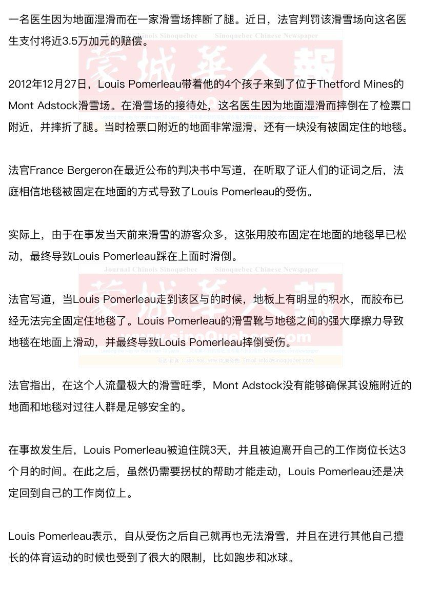 2014年,这名来自Thetford Mines的医生将这家滑雪场告上了法庭,并索赔20万加元。 虽然被判胜诉,但是法官只准许了34535加元的赔款,并表示受害人在这起事故当中也负有一定的责任。他当时并没有把自己的滑雪靴系好,他的靴子的上半部分的安全扣也没有扣上。 法官还发现Louis Pomerleau是这家滑雪场的常客,他在这里滑雪有20年的历史了。这也被认定是他有可能在附近走动时不够小心的证据。 法官France Bergeron在判决书中写道,Louis Pomerleau当时走动的速度相当快,而且并没有在意自己落脚的地方。他走动的方式并不像是其他滑雪者刚刚到达滑雪场、在积雪和积水之间小心走动的样子。法官认为这起事故为Louis Pomerleau造成的损失超过8.6万加元。但是由于粗心大意,Louis Pomerleau在这起事故中自己应负60%的责任,所以法官只判给他相当于总损失40%的赔款。 |