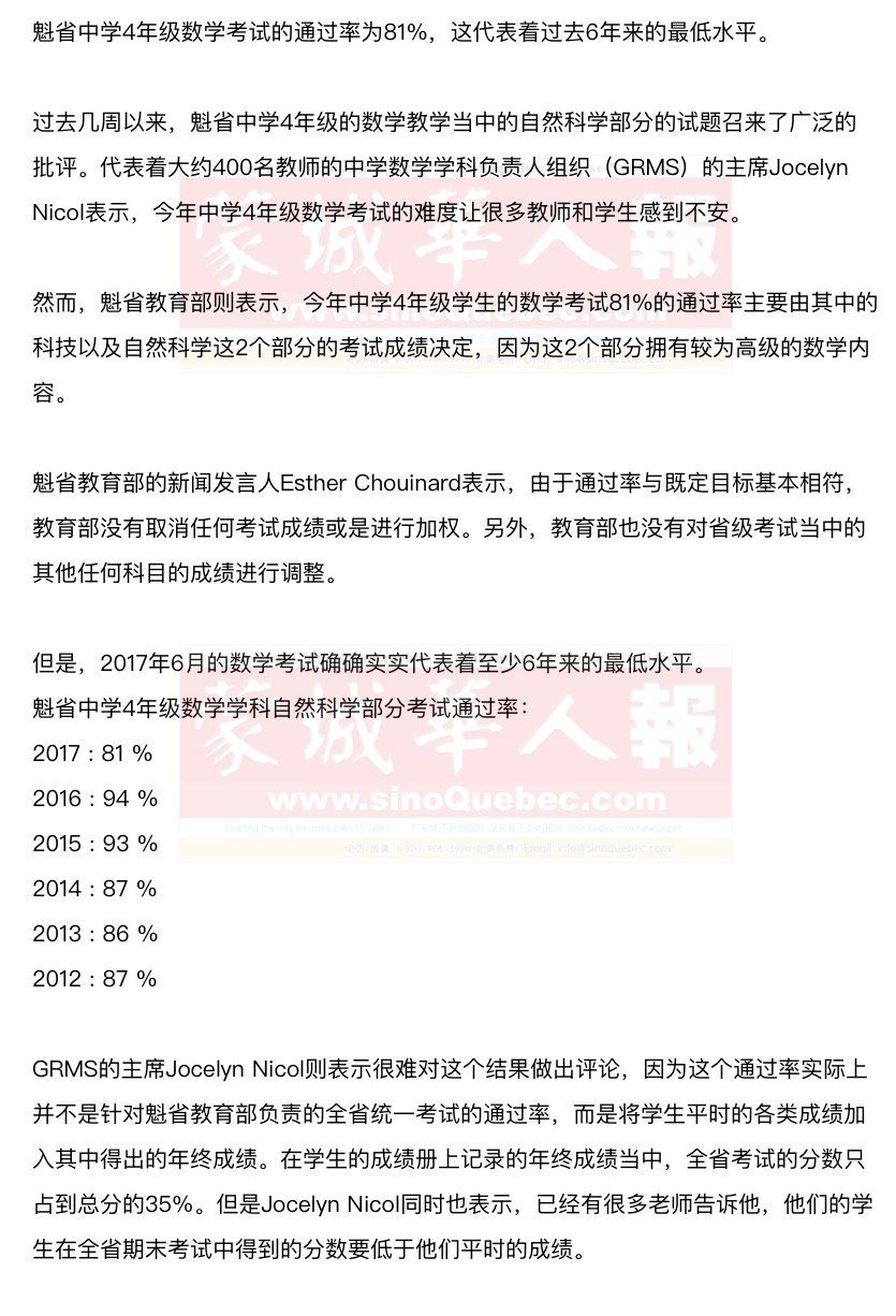 GRMS在6月底对其会员展开了一项调查,希望了解他们对今年数学考试的难度的评价。调查的结果是,今年魁省中学4年级数学考试的难度令人担忧。 魁省教育部则表示,全省年终考试的试卷是由一支包含多名成员的队伍完成的,其中包括教师与教学专家。 魁省教育部的新闻发言人Esther Chouinard表示,教育部将会对考试的试题进行更深入的分析,以了解其难度对于一些学生来说是否过高。 |