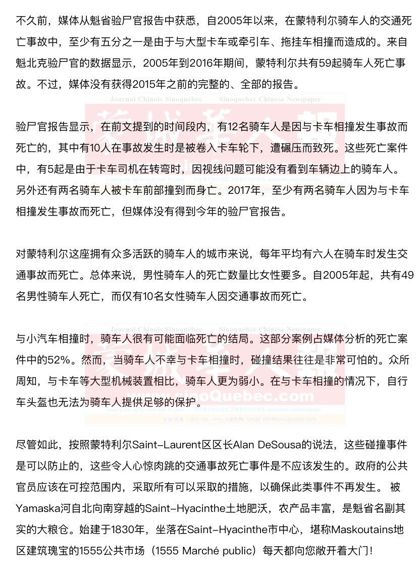 2012年,Saint-Laurent区区政府做出决定,强制性要求大卡车和重型车辆安装侧导板。侧导板是安装在卡车前后轮之间的障碍物,可以保证行人或者骑车人不被卷入车底。区长表示,这是一种预防性措施,能够大大改善公共安全。在三年的时间里,该区已经对现有大型车辆进行了类似的改造,并要求所有新近投入使用的卡车都必须安装侧导板。后来,蒙特利尔市政府也为市政府所属卡车安装了侧导板,但却并没有在私人卡车上实施这项规定,因为此种规定需要由加拿大交通部来颁布实施。