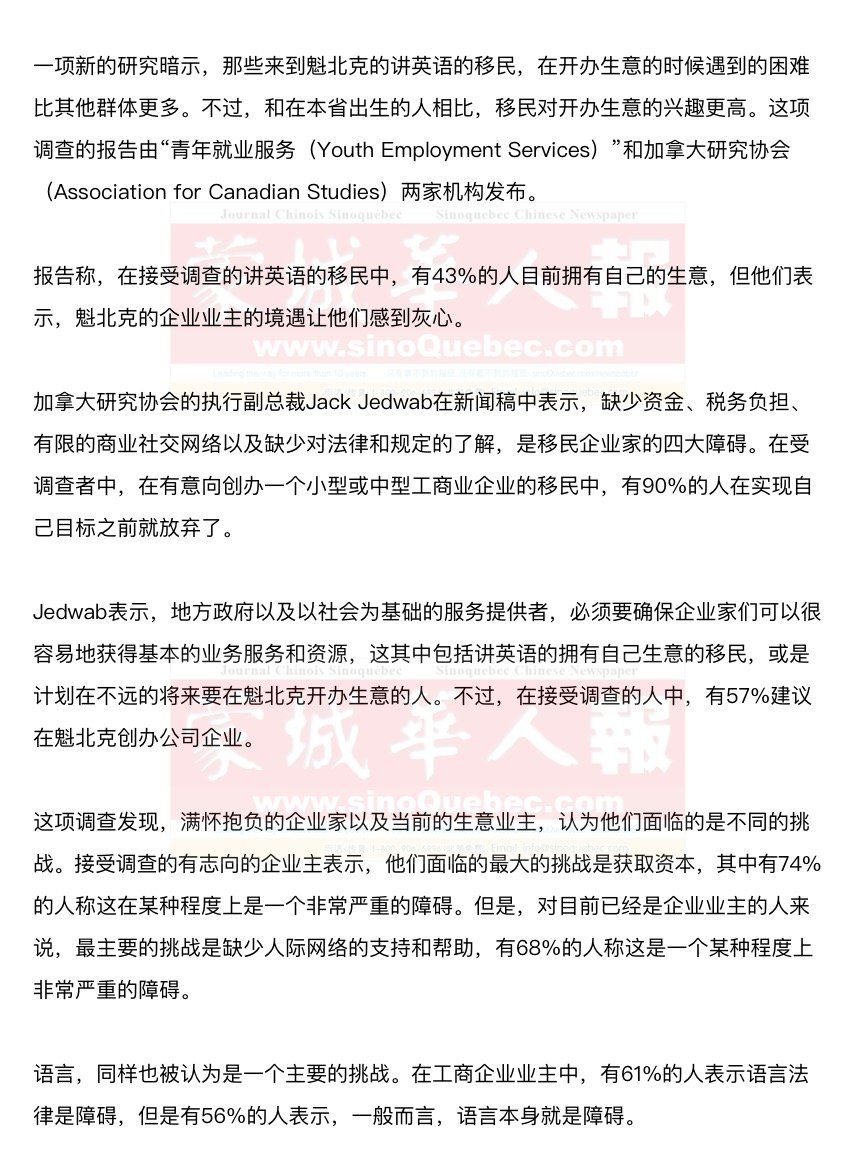 这项研究建议政府增加资金,用于以移民企业家为主要对象的英语服务以及支持项目,改善融资政策,修改税务法律,以此来鼓励魁北克公司企业的增长;同时,还要扩展社会驱动型的项目,包括点对点的支持等等。 调查报告援引了一份2015年的研究称,与其他魁北克人相比,移民对企业家身份更感兴趣,有企业家意向的人所占的比例达到了32.3%,相比之下,其他魁北克人的比例只有18.8%。这份调查由联邦政府提供资金支持,在线对魁北克253名讲英语的企业家进行了调查,并且对35名企业家进行了个人采访,最后形成了调查报告。接受调查的移民分别来自52个国家。 |