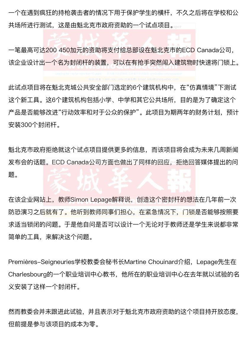 目前,魁北克市地区还没有任何一家学校教委会正式申请参与这个项目。ECD Canada公司制作的密封杆旨在简化某些学校实现的防恐演习。该企业称,当警报响起,只要立刻降下密封杆将门锁上,锁门过程可能仅需5秒。 资料来源:www.ecd-canada.ca |