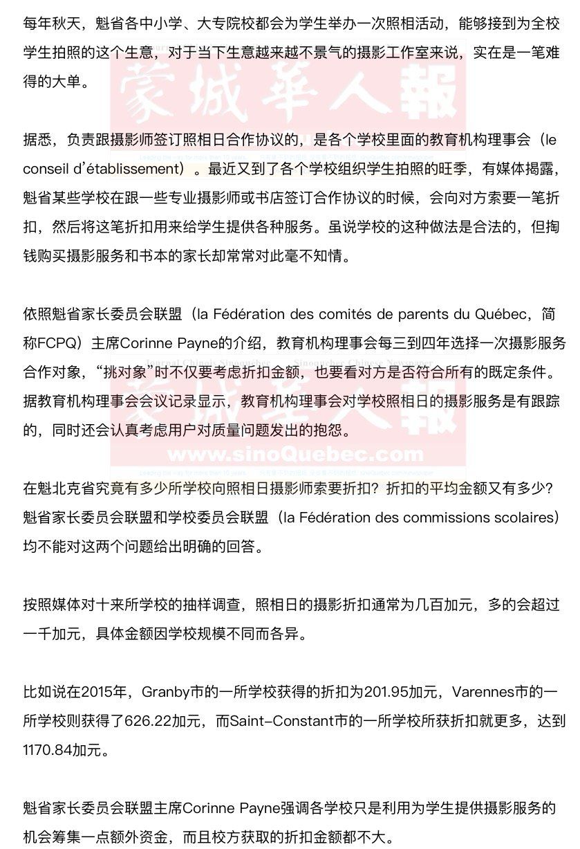来支付学生集体外出活动费用,也可以被用来购买学习用品或在校内组织文化艺术表演。 据悉,Boite blanche摄影工作室的Patrick Poirier给学校的平均折扣是每个孩子0.75加元。如果一所学校有300个学生,它获得的摄影折扣即为225加元。 Patrick Poirier虽然不愿透露他的摄影公司跟多少所学校有合作关系,但却坚信所有的学校都收取摄影折扣。他还说这是“一个根深蒂固的传统”。 魁省学校的这种折扣运作受到包括公共教育法(la Loi sur l’instruction publique)在内的好几条法律法规的管束。依照公共教育法第94条之规定,教育机构理事会不得寻求或接受与一些不符合学校使命的条件(其中包含一切形式的商业性质邀约)相关联的捐赠、遗赠、补贴或其他形式的资助。 深谙教育法的Yann Bernard律师对此作出了详细解释。他说像百事和可口可乐这样的公司就不能以捐赠来换取在中小学校园内安装可乐自动售卖机的权利。但学校照相日的摄影服务是另外一码事,因为要求服务的是学校而不是商家,而且商家也不为自己提供的服务及折扣向学校提出任何附加条件。 教课书书店的问题跟摄影有所不同。尽管学校的合作书店没有任何垄断行为,学生家长也不必到校方选定的书店购买书本或其他学习用品,但Yann Bernard律师还是认为合作书店存在的法律风险更大。比如说,可能会有一个书店找到某教育机构理事会,提出在校方发动学生家长到那个书店购买书本和学习用品的条件下,为学校捐资100至1000加元。Yann Bernard律师指出,书店在这种条件下捐款纯粹是为了给自己做广告,它提出的捐款条件等同于一种商业性质的邀约。 按照魁省教育厅的规定,如果一项捐赠是以鼓励学生、学生家长或其他到学校的人购买某种产品或服务为条件,那么教育机构理事会就不能够接受这项捐赠。 |