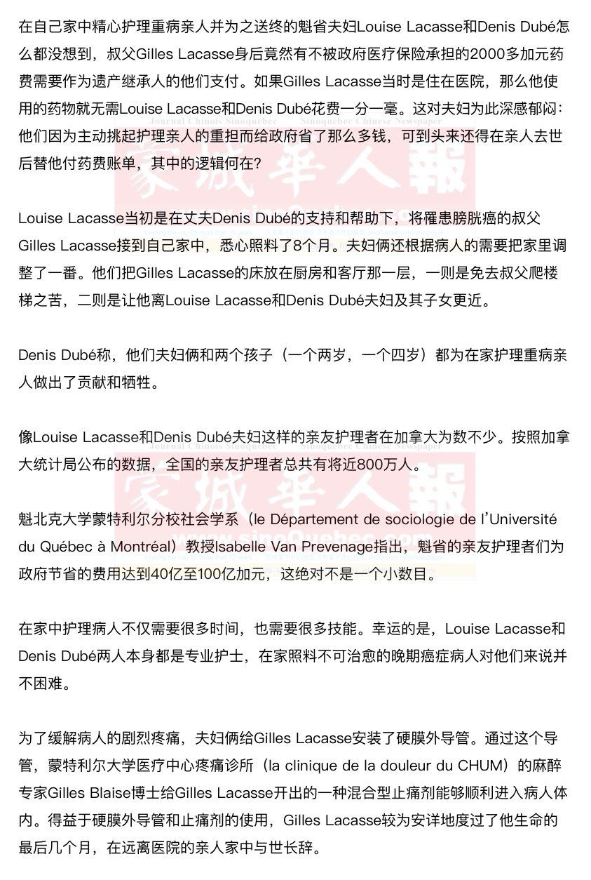 但是,Gilles Lacasse去世之后,成为了遗产继承人的亲友护理者Louise Lacasse和Denis Dubé却得知有一个意外在等着他们:因为Gilles Lacasse在家中使用的混合型止痛剂中含有不为魁省医疗保险(la Régie de l’assurance maladie du Québec,简称RAMQ)所覆盖的“可乐定”(clonidine,在某些医院可得,但尚未在加拿大上市),所以止痛剂的费用完全不能被报销。 按照魁省医疗保险管理局的规定,可乐定在医院使用是政府付费,在家使用则是私人付费。由于自费药可乐定的混入,Gilles Lacasse使用的混合型止痛剂中的其他公费药物也得不到政府报销,他的药费账单总额因此高达2000多加元。 Gilles Blaise博士对此深感遗憾,称不明白魁省公共卫生系统为什么会有如此规定,这对于那些给政府节省医疗费用的人来说未免太不公平。 Louise Lacasse和Denis Dubé说,他们不打算向不合理的现行制度屈服,目前正在等待行政法庭(le tribunal administratif)为改变医保局的决定召开听证会。 魁省医疗保险管理局拒绝了媒体的采访要求,不过该局在给媒体的一份电子邮件中强调,Gilles Lacasse的混合型止痛剂不能被报销是因为它含有一种未在加拿大上市的药物。 |