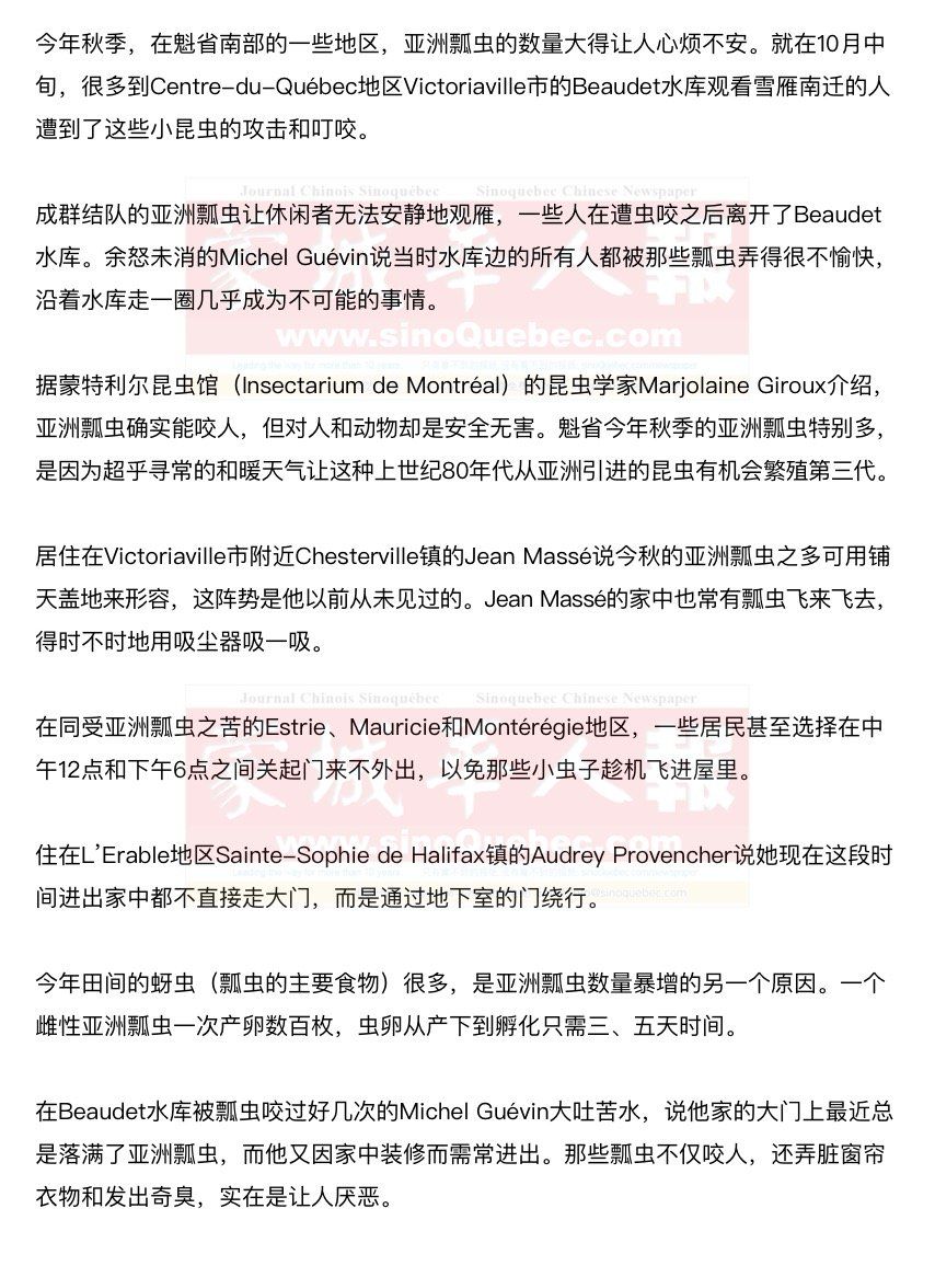 昆虫学家Marjolaine Giroux解释说,虽然亚洲瓢虫对人类健康不造成任何危险,但它们为驱走天敌分泌出的黄色液体会令人感觉恶心不适。 Marjolaine Giroux建议人们堵塞家中门窗的缝隙,等气温彻底降下来之后再撤掉纱窗纱门。如果有亚洲瓢虫飞进屋里,最好是把它们放回室外,而不是杀灭,因为这些瓢虫是免费的“田间工人”,对有机农业非常重要,能够很好地替代农药。 美国农业部农业研究局上世纪70年代末和80年代在全国放飞了成千上万只亚洲瓢虫,让它们去消灭蚜虫。没想到,最近几年一群群的亚洲瓢虫开始聚集住宅和花园内,成为一害。 |