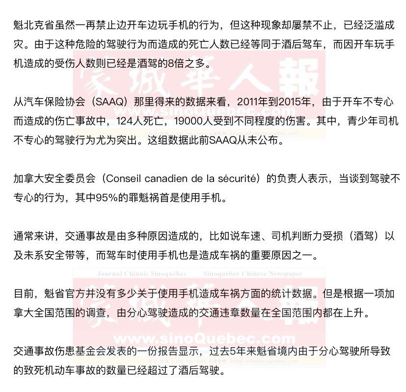 驾车时使用手机为什么危险 ♦ 在以90公里的时速驾车时用4-6秒读一条短信,这就好像在双眼紧闭的情况下横穿一座足球场。 ♦ 开车时发短信所带来的撞车的风险是平时的23倍 ♦ 一项研究的结果显示,在80%的车祸当中,司机事发前都将视线从前面的道路移开了至少3秒钟 ♦ 67%在开车过程中发短信的人都承认自己在接到新信息后无法抑制住自己读短信的欲望 ♦ 35%在开车过程中发短信的人都承认自己在收到一条新短信后必须马上回复 ♦ 18%的司机承认自己曾经在开车时发短信 ♦ 99%的魁北克人都认为在开车时读短信或是写短信是非常危险的 |