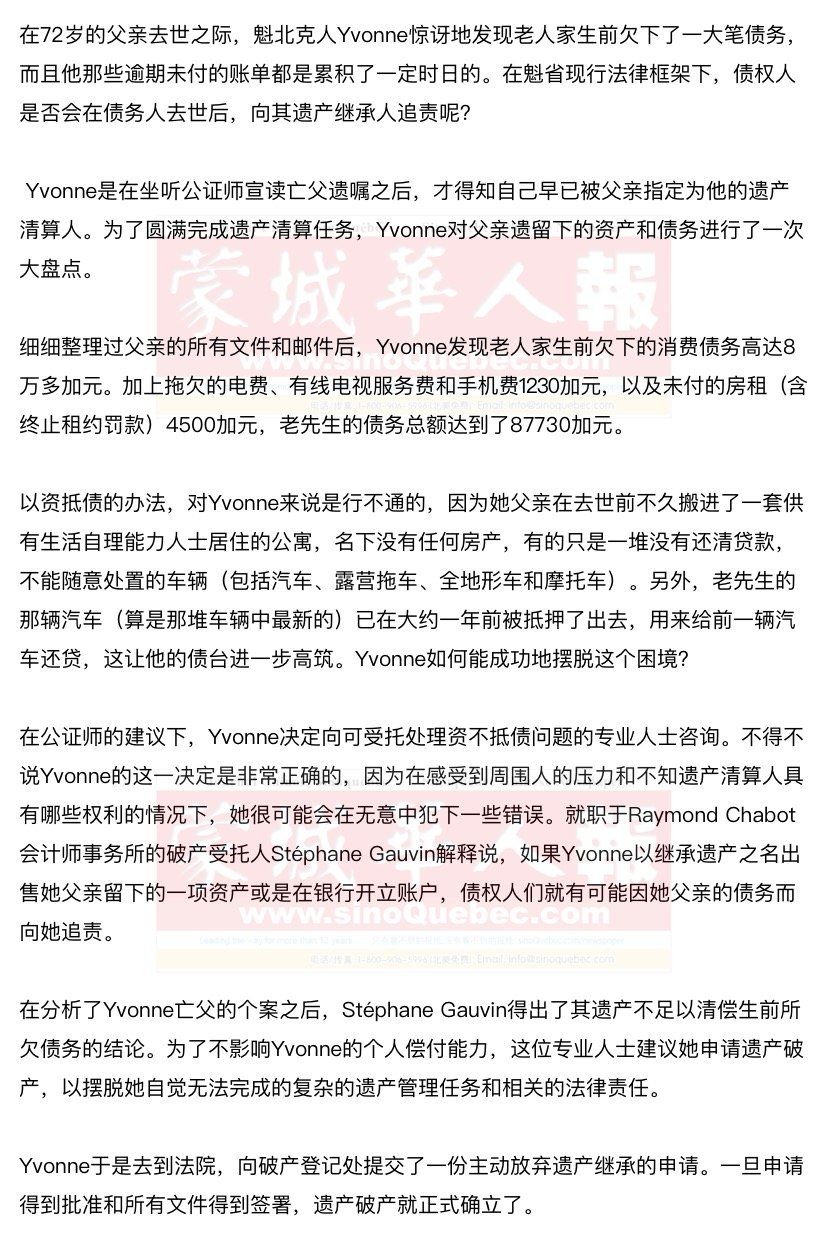 Stéphane Gauvin随后将Yvonne亡父遗留下的一部分资产直接还给了某些债权人,同时将另一些物品变卖出去,再把卖得的钱按比例分还给余下的那些债权人。 跟她的兄弟姐妹一样,Yvonne没有拿到父亲遗产的一分一毫,因为债权人在遗产分配中享有优先权。不过,她终于是可以踏踏实实地睡她的安稳觉了。 |