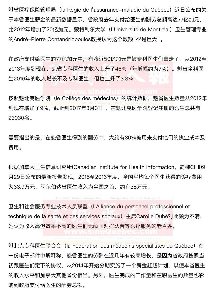 今年3月,魁省卫生厅厅长Gaétan Barrette宣布医生薪金赶超计划已经完成。但是现在按照省政府与全科医生联合会签订的一份原则协议,魁省全科医生的收入在未来三年中(亦即到2020年)还将增长10%。专科医生联合会与政府的谈判仍在继续。 不过,André-Pierre Contandriopoulos教授指出,医生们的收入提高并不意味着老百姓看病更加容易。他说魁省纳税人现在好比是花钱不讨好的“受气包”,用高薪养了很多医生,但却没能得到他们应得的服务。 |