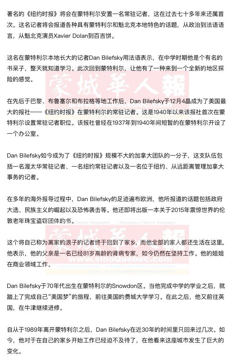 他回忆,由于全民独立公投等大事件,他成长在一个沉重的社会环境中。在他看来,如今年轻一代的魁北克人更加自信、双语能力更强,眼光也放的更远。他表示自己将不会放过魁北克和魁北克人的身份及自我认知的问题,尤其在西班牙的加泰罗尼亚和英国的苏格兰等地区都开始更加频繁的提出主权问题这样一个背景下。 作为一名东欧移民的曾孙子,Dan Bilefsky自然也会更加关注移民政策等问题。在他看来,加拿大在移民问题上代表着一个高度进步的模式,而他则希望探讨这样的模式为这个国家带来了怎样的现实。Dan Bilefsky还颇为自豪的聊起了自己曾祖父,包括他如何靠着在街上卖水果卫生,以及这个不起眼的卷发男孩如何靠着扔粉笔引起一名在附近学校里上学的漂亮魁北克女孩的注意等 。 作为一名不折不扣的“吃货”,蒙特利尔的美食自然也会成为Dan Bilefsky关注的话题。他表示,除了让这座城市闻名于世的百吉饼和熏肉,蒙特利尔还有种类繁多的食物让这座城市成为了名副其实的美食之都。 对文化话题充满兴趣的Dan Bilefsky还会向《纽约时报》的读者们讲述关于魁北克的明星们的故事。他表示,虽然席琳迪翁举世闻名,但魁省和安省还拥有很多非常有趣但知名度相对较低的明星。他尤其喜欢看Xavier Dolan的电影以及听魁省说唱歌手的音乐。 虽然他将会在蒙特利尔工作并且会密切跟踪魁省的政治新闻,Dan Bilefsky仍然表示他的首要身份是《纽约时报》的驻加拿大记者,也就是说他将有机会跨越整个国家来报道发生在其他地区的新闻。 美国之外的最大市场 对于《纽约时报》来说,加拿大是美国本土以外的最大市场,并且在过去1年来实现了强劲的增长。 《纽约时报》的国际部门NYT Global的主编Jodi Roduren表示,《纽约时报》在全球范围的读者数量在一年内增加了62%,而加拿大读者们在其中扮演了重要的角色。Jodi Roduren拒绝给出该报纸在加拿大的具体的读者数量。但是她表示,《纽约时报》有350万名读者,其中250万人是在线读者。这其中,有14%来自美国以外。 Dan Bifelsky还表示,自从贾斯汀特鲁多担任加拿大总理以及唐纳德特朗普入主白宫以来,《纽约时报》对加拿大的兴趣就越来越大。他认为,这是一个对加拿大来说相当重要的时期,因为我们迎来了一名在全世界范围内都颇受欢迎的总理。加拿大如今已经成为了全世界的自由化以及进步主义的典范。他还强调了特鲁多与美国总统特朗普所代表的形象的鲜明对比。 Jodi Roduren表示,虽然《纽约时报》一直有着在温哥华安置一名记者的想法,但是自从Dan Bilefsky被选中成为新的驻加拿大记者之后,蒙特利尔就成为了他的目的地,这是因为他是一名土生土长的蒙特利尔人,而且会双语。 |