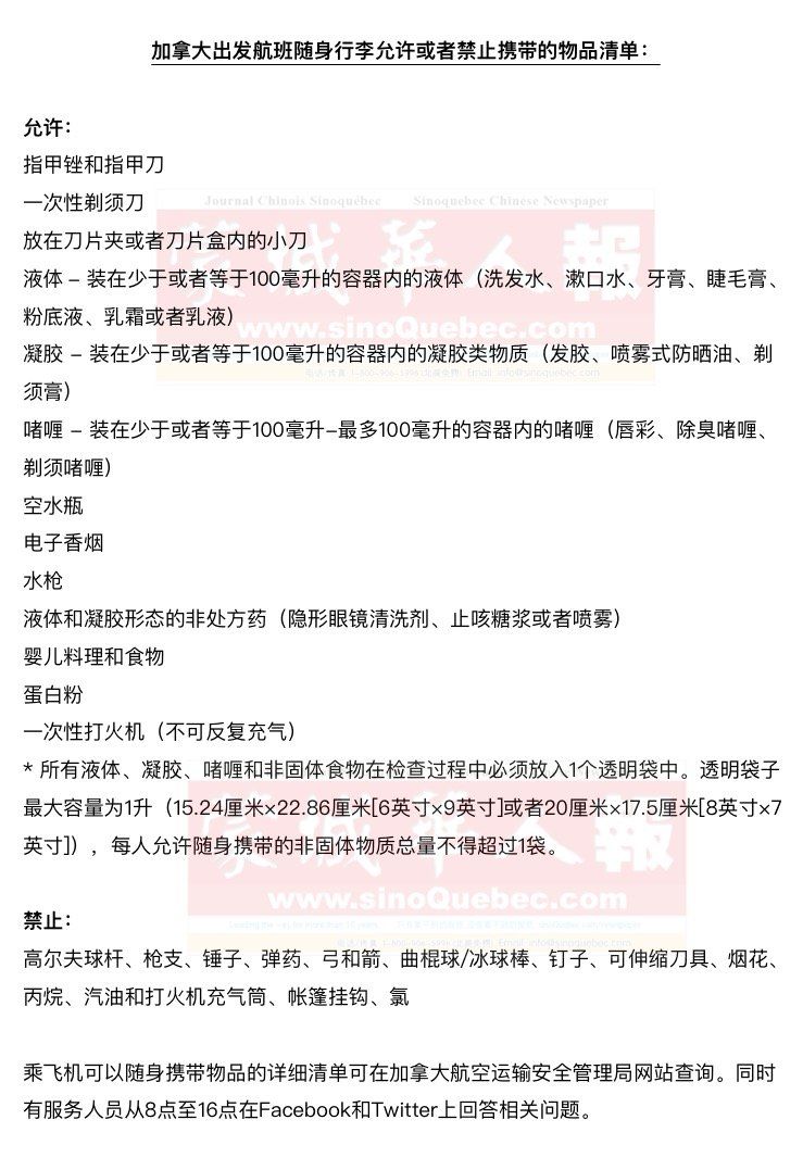 加拿大联邦政府决定,将限制允许带上飞机的婴儿奶粉量,同时允许携带长度小于6厘米小刀上飞机。新规于11月27日起执行。 从今以后,从加拿大离开的乘客必须将随身携带的粉状物或颗粒物(婴儿爽身粉、爽脚粉、烹调粉、浴盐、海盐、沙子)控制在350毫升以下。但对托运行李没有限制。 刀片长度小于或等于6厘米的小刀(小剪刀、折叠小刀)可以放入随身行李带上加拿大国内及国际航班,但是飞往美国的航班除外。 加拿大交通部长Marc Garneau指出,这些修改令加拿大的规则调整至与国际标准相一致。他提到,这只是一个认知上的改变,即长度小于6厘米的刀片不会对航空安全构成威胁。不少人都愿意随身带上一把小剪刀或者折叠小刀来修剪指甲或者做别的什么。而渥太华的反对党则从中看到了对于佩戴锡克弯刀(Kirpan)的锡克教徒的宗教妥协。 对于液体的限制从2006年就开始执行了,当时一群恐怖分子曾经计划借助于放在随身行李中的液体炸药来同时炸毁几架飞机。 加拿大航空运输管理局官网:http://www.catsa.gc.ca/breezethrough |