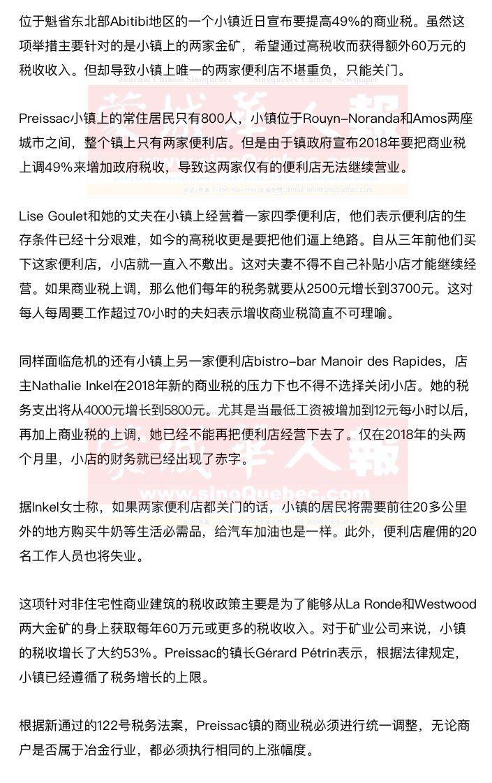 Pétrin先生表示,小镇的居民已经习惯于从临近的城市Amos和Rouyn-Noranda采购大量的生活用品,小镇上的其他商户也都面临着倒闭的命运。 但是,这位镇长认为,他管理下的城镇有着很健康的财务状况。在他看来,有些需要放手的事情就不必执着。小镇还有很多计划和项目等着用钱,比如镇政府的购置消防车计划。 自从2018年的财政预算被通过,企业家Sébastien Martel就因为税务问题推迟了他对商业车库翻新的计划,同时也筹划着出售他的住房。 工业方面,Thermodoor公司的副总裁Marilyne Pelchat女士认为,从2016年以来,小镇针对商务税收的调整已经上涨了50%。 不少企业想要搬离这里,前往更接近人力市场资源的大城市。她表示,如果在税务上没有优势,企业也就没有理由继续待在这些偏远的地方了。 |