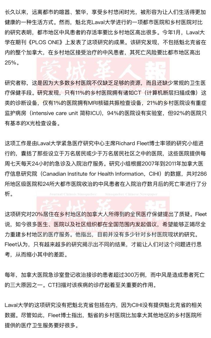 在此之前,一项发表在另一份开放数据期刊《BMC Health Services》上的研究表明,在魁北克26所乡村医院中,有74%的医院拥有CT扫描仪,78%的医院设有重症监护室,并且可以开展普外科手术。同时,这些乡村医院的医护人员还能够通过远程医疗手段Tele-health,与都市地区的专家们进行沟通。加拿大心脏病及中风基金会指出,有中风症状的患者在被送到急诊室后,应该尽快进行CT扫描检查,以便确定是否应该立即施用血栓疏通药物,从而使患者的脑损伤及发生其他并发症的可能性降至最低。 Fleet博士指出,在中风的治疗中,有一个说法是:时间就是大脑。每过一分钟,患者的脑细胞就会多死亡一点。在急性脑中风的诊疗上,大多数乡村医院都是不符合现行诊疗标准的。因此,与人员和设备配备精良的都市医院相比,更有可能会导致较为恶劣的结果。对此,Fleet表示,政府当局应该对乡村医院和都市医院之间的这种不均衡状况多加关注。 |